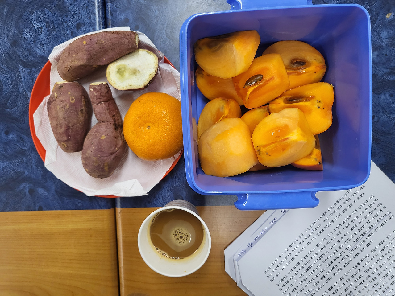 분위기가 한창 무르익어 갈 때쯤 오랜만에 나온 J작가님은 양손에 가득 들고 온 간식을 펼쳤다. 유기농 고구마와 껍질까지 먹어도 떫지 않고 아삭아삭 감칠맛 나는 감, 귤을 접시에 차려 냈다. 달달한 커피와 함께 이야기가 버무려져 풍성한 식탁을 만들어 냈다.