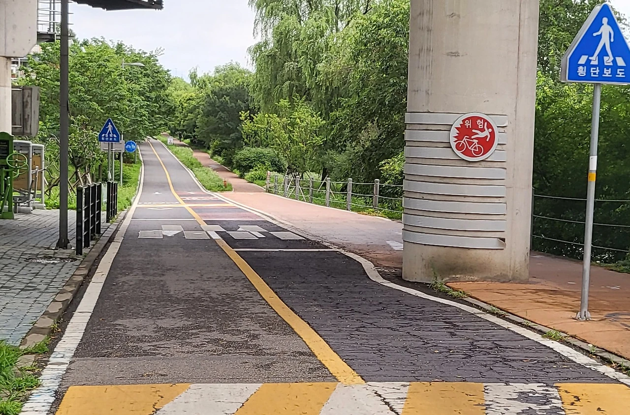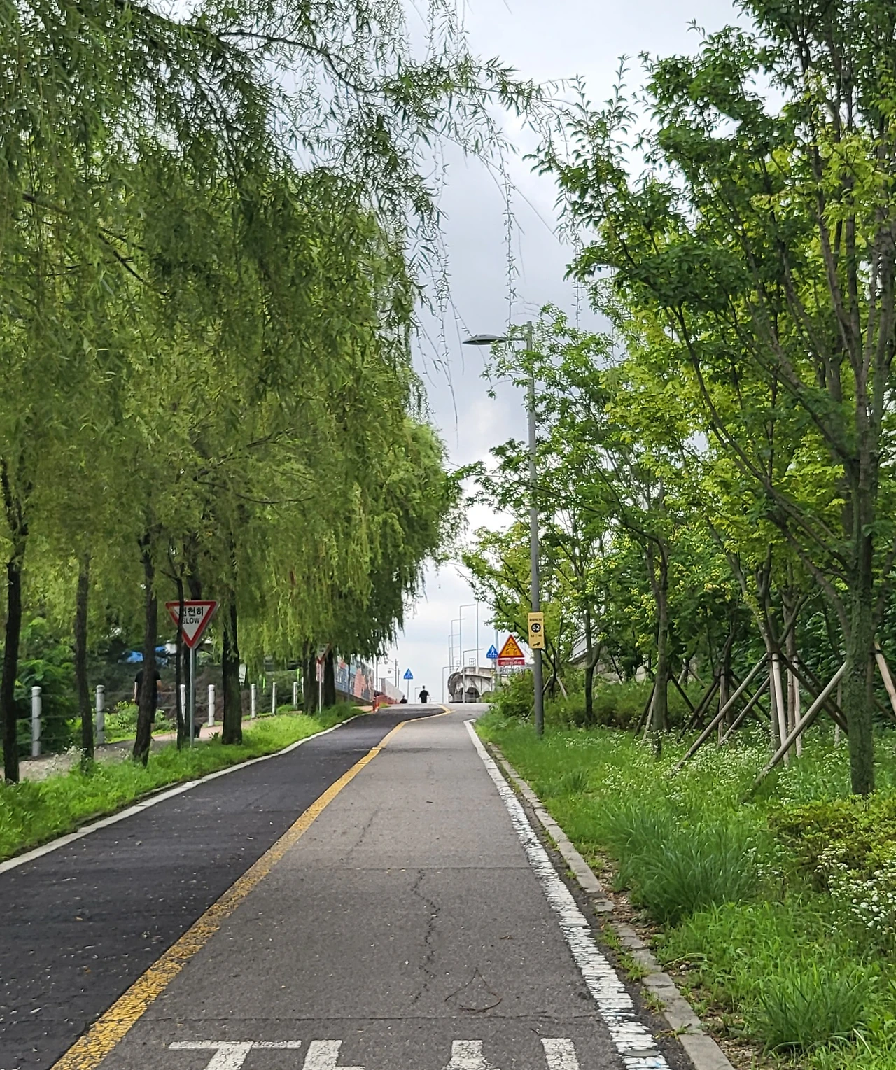 커브가 있는 구간, 오르거나 내려가는 구간 바닥에는 늘 과속방지턱과 함께 ‘천천히’라는 글이 그려져 있다. 빠르게 지나갈 필요 없다. 그냥 천천히 그리고 묵묵히 나아가면 된다. 내 길 위에는 나의 자전거와 나만 있다.