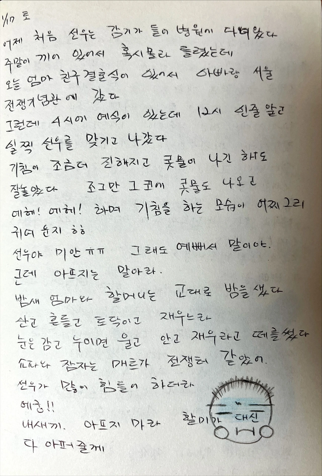 작은 몸으로 기침도 하고 그 자그마한 코에서 콧물도 나오는 이 작은 존재가 외할머니 눈에는 너무 사랑스러워서 "선우야 미안. 그래도 예뻐서 말이야"라는 말을 하셨다고 합니다.