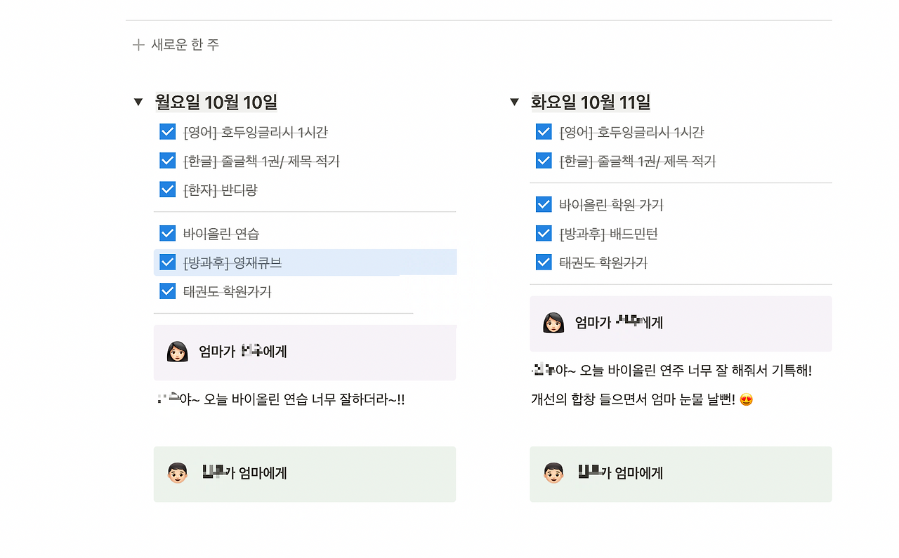 아이는 집에 있는 컴퓨터에서 노션을 사용하고, 저는 회사에서 사용하는 컴퓨터나 휴대폰으로 노션을 사용하며 아이가 학교에서 돌아와 하루에 해야 할 일들을 잘하고 있는지 볼 수 있어요.