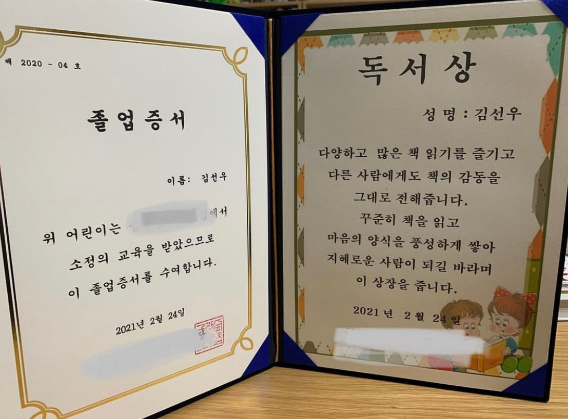 아이의 독서는 어린이집에서도 이어져 7살 졸업식에는 독서상을 받기도 했답니다.