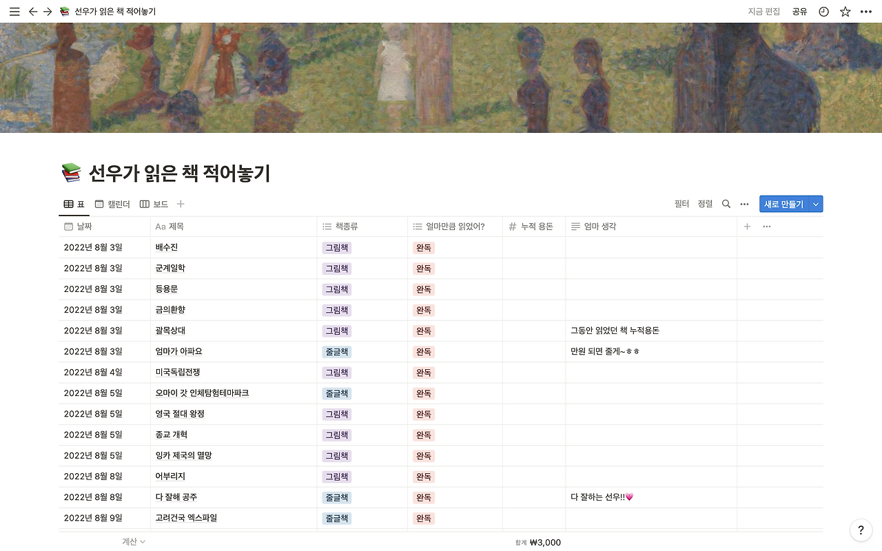 그리고 이 노션 페이지를 출력해서 여름방학 동안 읽었던 독서목록으로 제출하기도 했답니다.