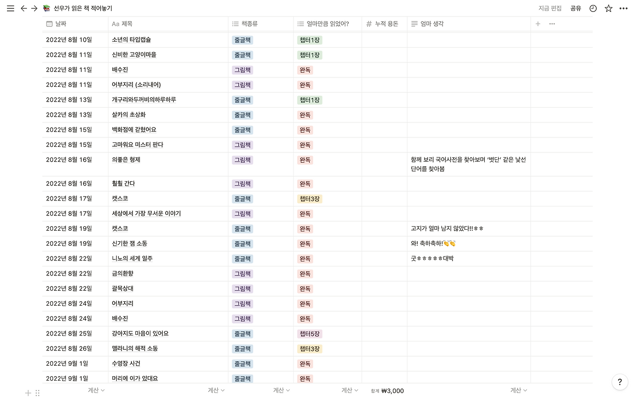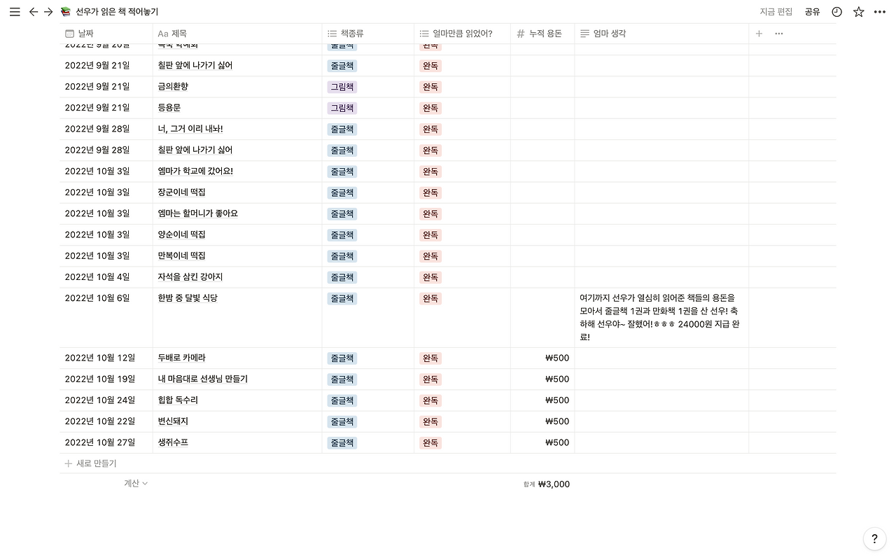 그렇게 노트에 읽을 때마다 아이가 읽은 책 제목을 적고 그 옆에 금액을 500원씩 적어서 기록했습니다.