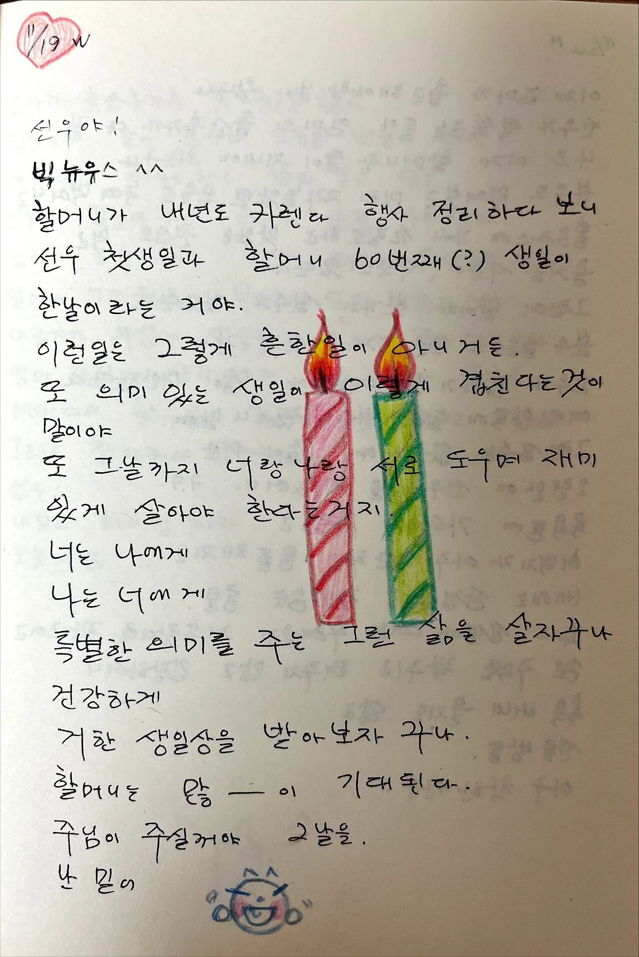 흔하지 않은 귀한 이벤트가 한날이라는 사실에 엄마는 다가올 선우의 첫돌과 엄마의 60번째 생일인 그날을 손꼽아 기다리셨습니다. 두 사람 모두에게 의미 있는 생일날이 같은 날이라니 두 사람의 인연은 보통이 아니었네요.