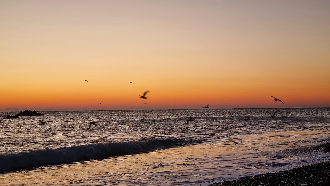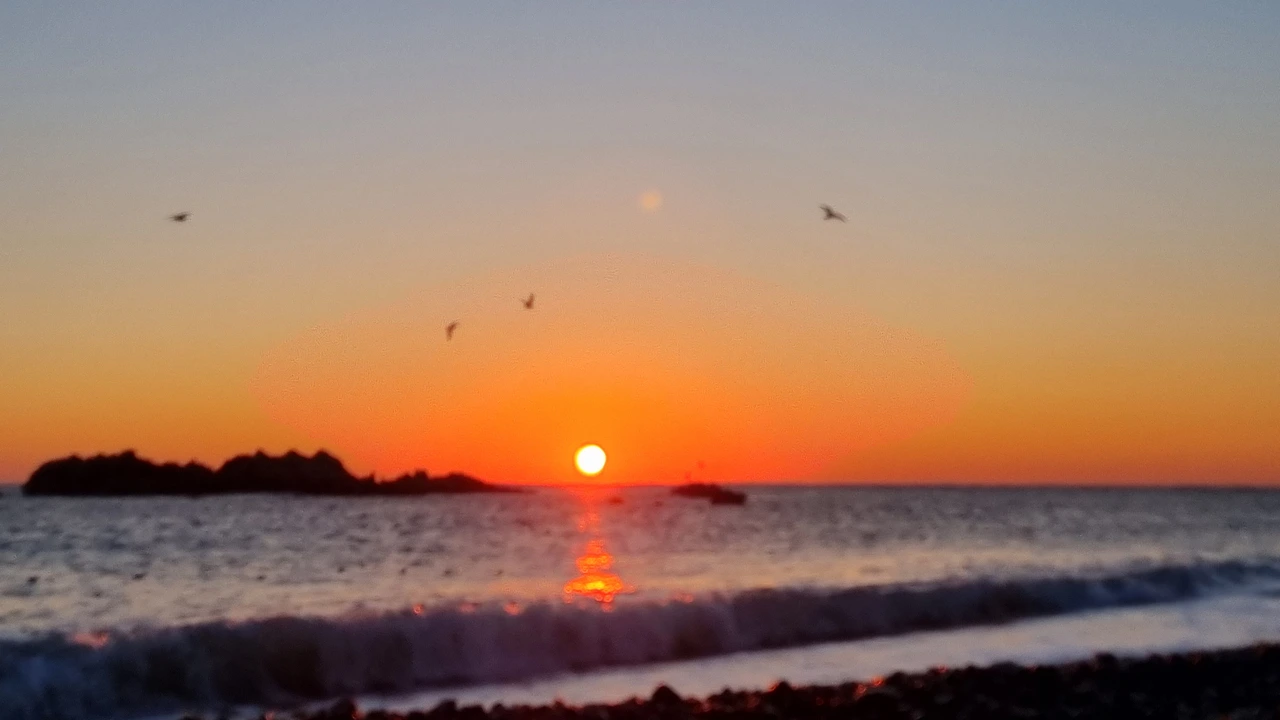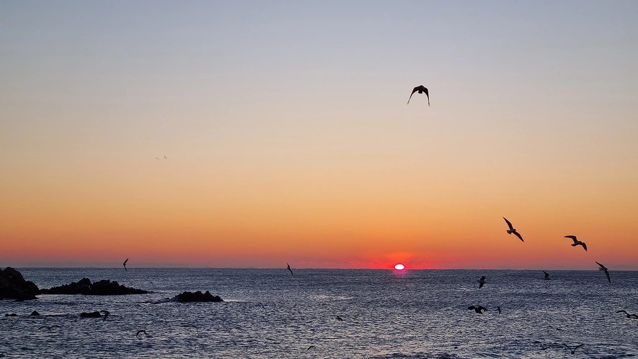 차가운 새벽 공기, 수평선을 발갛게 물들이며 비상을 준비하는 시간이 만들어내는 경건함, 신비함, 아름다움. 출렁이는 검은 파도, 어둠을 걷어내며 끼룩대는 갈매기들.