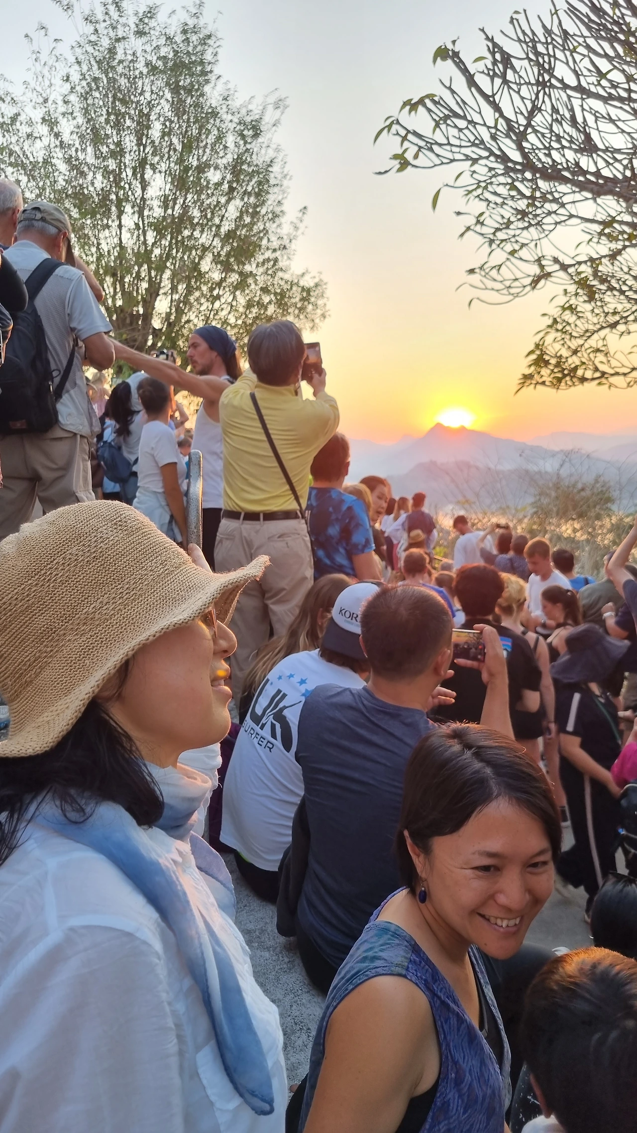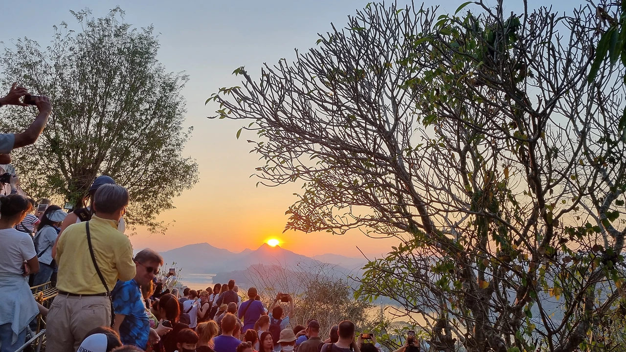 해가 지고 어둠이 깔리는 모습을 보기 위해 모여든 사람들. 다행히 날이 맑아 정말 예쁜 일몰을 볼 수 있었다. 해는 산마루로 가라앉으며 메콩강과 산, 하늘과 나무, 사람들까지도 붉게 물들인다. 자연의 색채는 인간의 언어가 얼마나 빈약한지 일깨운다. 감탄과 기도만 남는다.