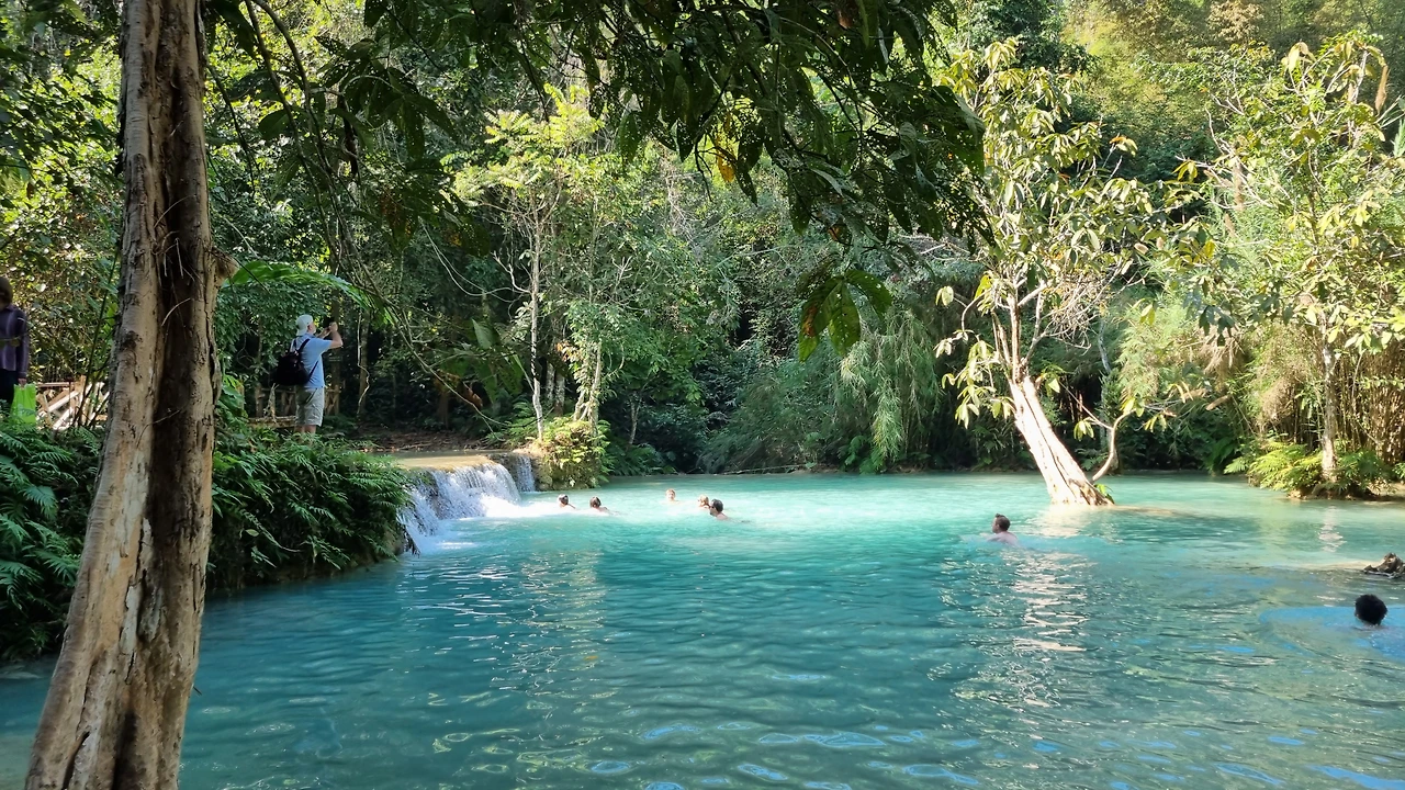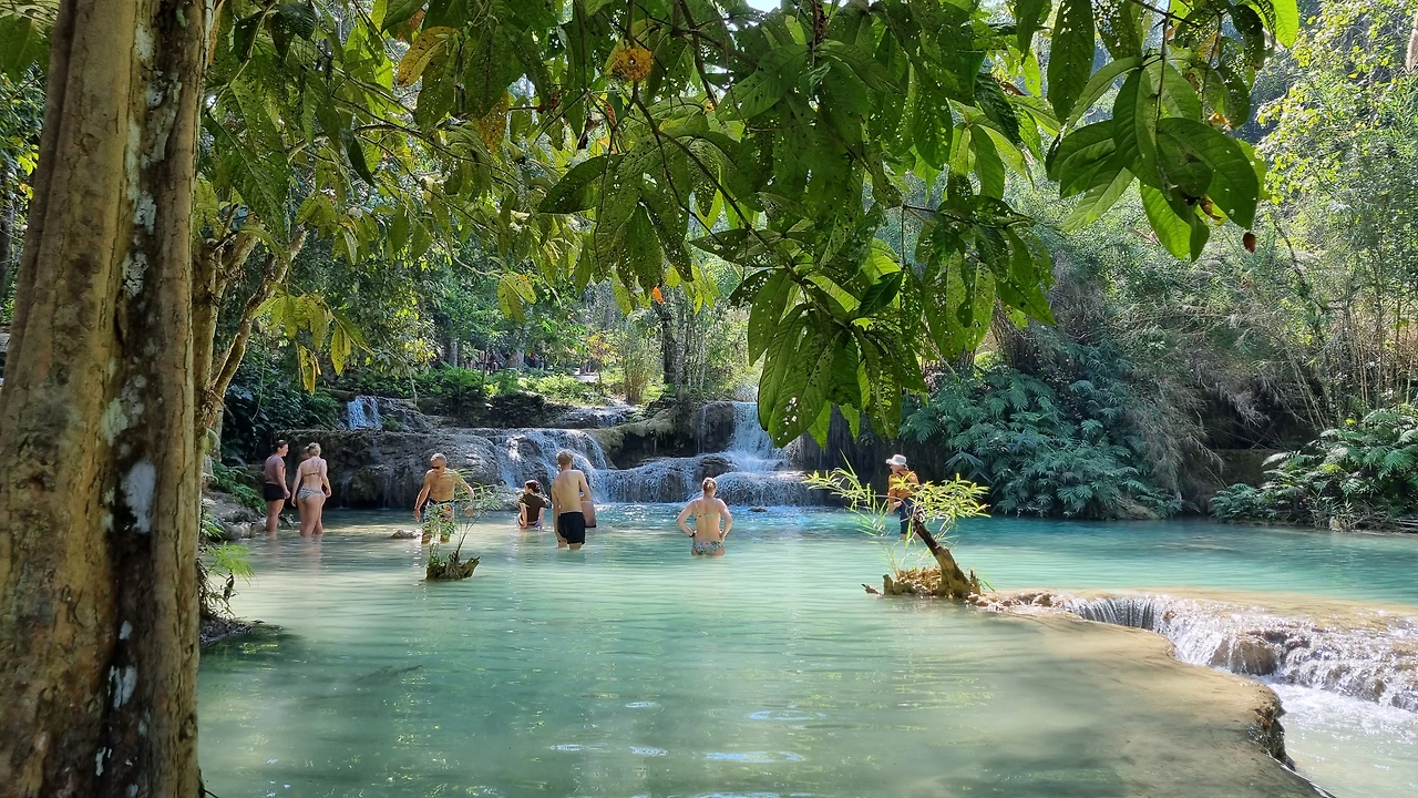 열대림에 숨겨진 천국 같은 꽝시폭포에서 여행자들이 물놀이를 즐기고 있다