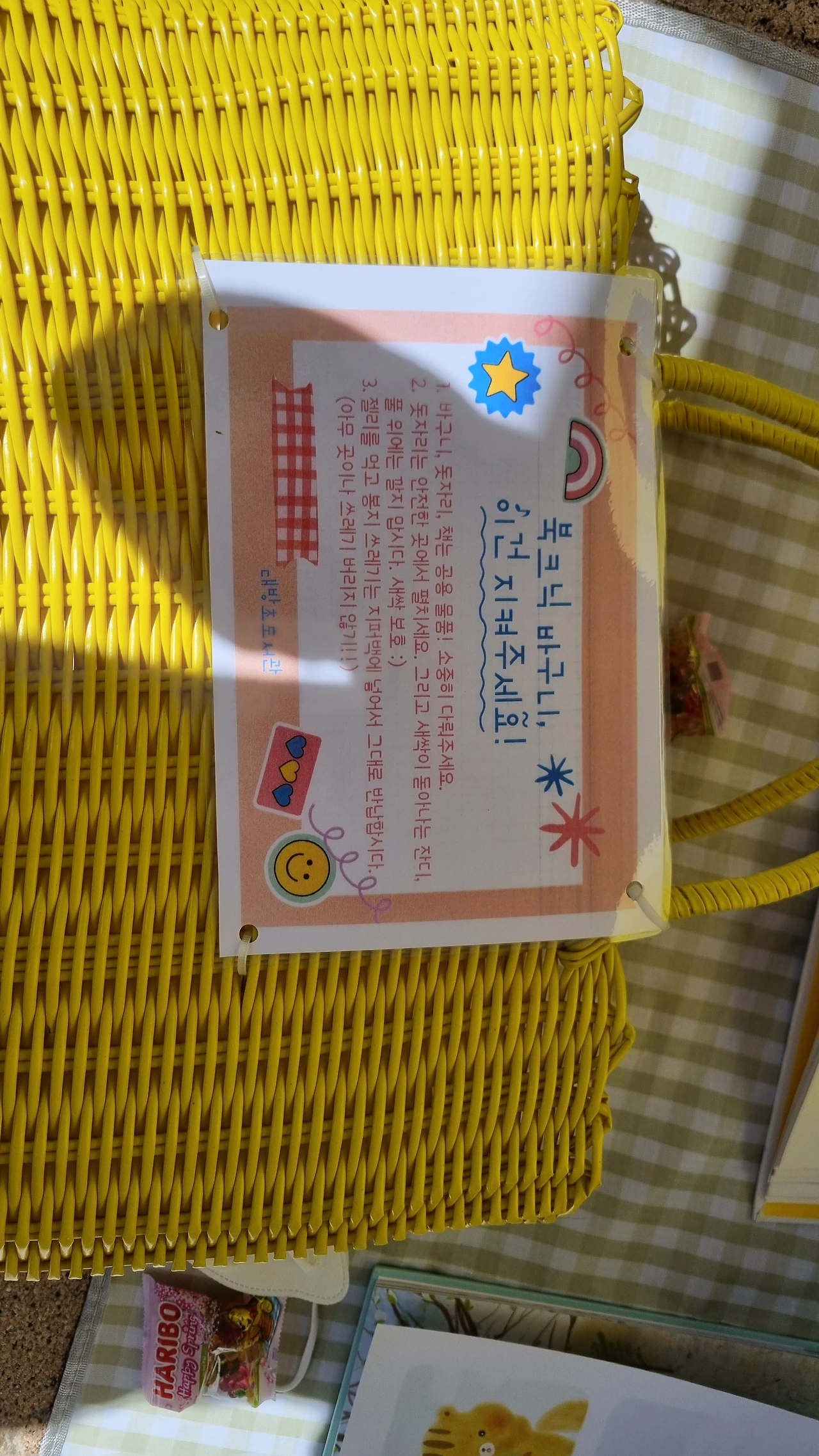 센스 있는 사서선생님은 책바구니에 아이들이 좋아하는 '하리보 젤리'(곰모양이 아니라 벚꽃모양이^^)를 넣어서, 소풍기분을 뿜뿜 낼 수 있게 했어요.