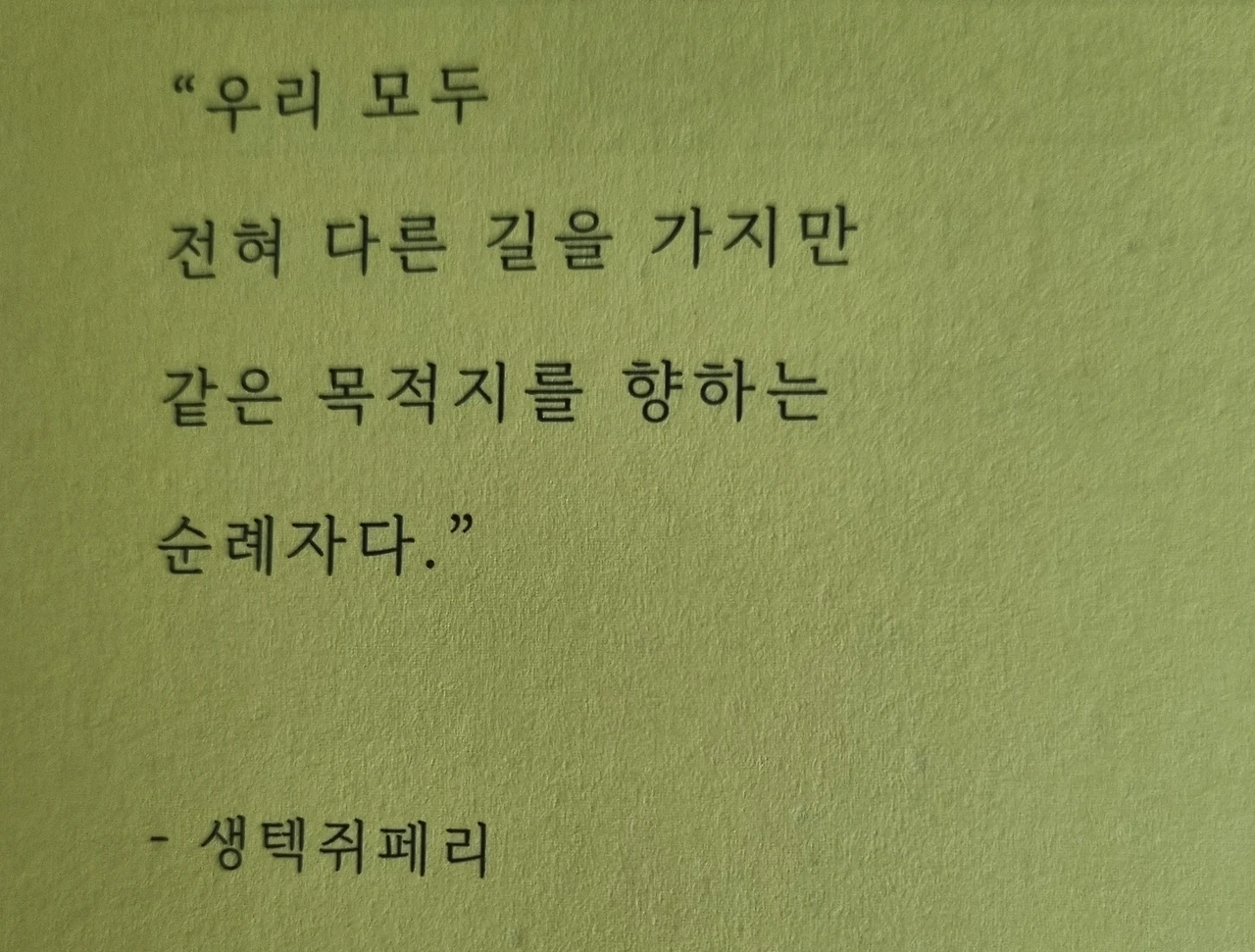 카미노를 걷는 사람은 저마다 이유가 있다. 어떤 이는 단순히 걷는 것이 좋아서 산티아고 순례를 나선다. 지금 삶에서 멈추고 미래를 고민하기 위해서 온 사람도 있고, 자신의 일상과 책임에서 벗어나고 참된 자아를 발견하기 위하여, 처음의 모습으로 거듭나는 것을 배우기 위하여 멀리 길을 떠나온 사람도 있다. 카미노에 있는 사람은 그 동기가 무엇이든 상관없이 모두 순례자이다.(89쪽)