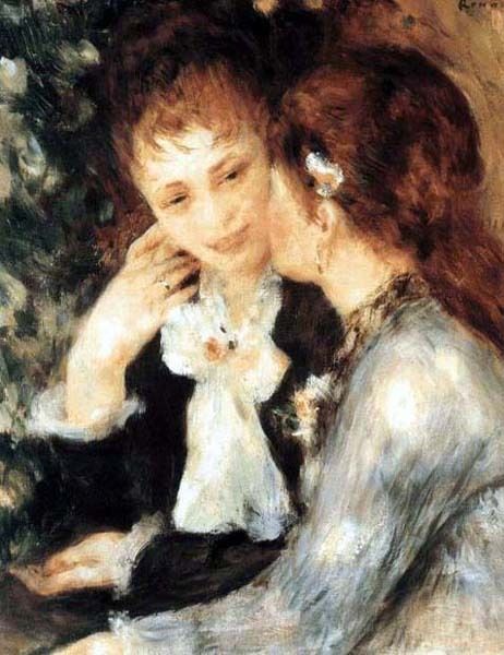 소곤소곤 긴밀한 이야기를 나누는 것 같습니다. 자매일까요? 친구일까요? 나의 생각에는 동생이 언니에게 무언 가 비밀스러운 이야기, 예를 들면 '그 청년이 언니를 마음에 두고 있는 것 같아.'와 같은 소식을 전해주는 것 같습니다. 하얀 리본 달린 블라우스를 입은 언니처럼 보이는 여인의 입가에 살짝 미소가 번지고 내려다보는 은은한 눈빛, 오른쪽 빰에 스치듯 닿은 하얀 손과 그 팔을 감싸 안은 외쪽 손에서 기분 좋은 설렘 같은 것이 느껴집니다. 차분하고 내성적으로 보이는 언니는 동생에게만 자신의 마음을 내보였을지도 모릅니다. 그리고 이런 순간이 꿈처럼 다가온다면 하고 기다리고 있었는지 모릅니다.
