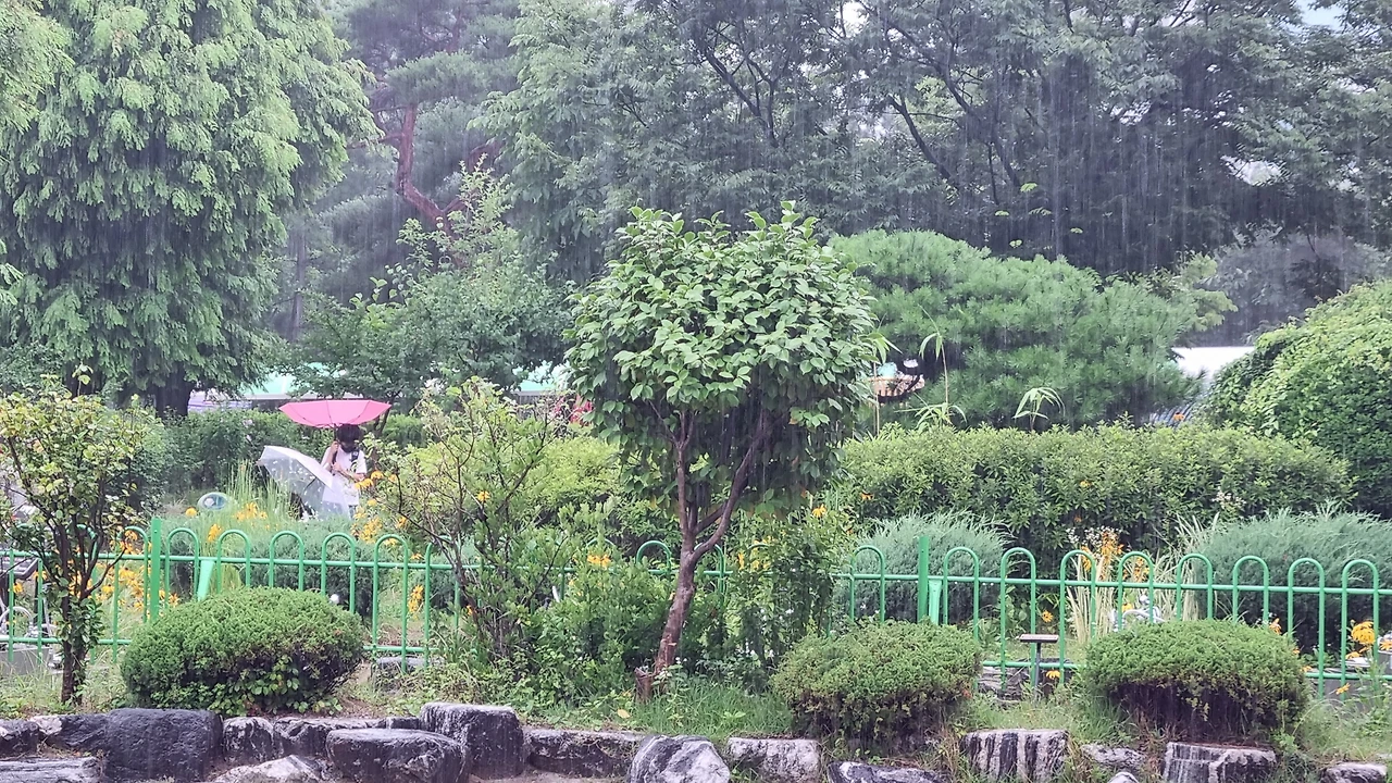 하교 시간, 장맛비가 직선으로 좍좍 쏟아집니다. 창문을 열고, 방충망도 열고 거침없이 쏟아지는 비를 멍하니 바라봅니다. 풍경이 그대로 평화가 되는 순간입니다. 비의 시원한 직선을 잡아두고 싶은 마음이 듭니다. 한 컷 찍어봅니다. 렌즈 안으로 빨간 우산, 하얀 우산이 나타났습니다. 빨간 우산을 뒤집어 쓴 아이 모습이 귀여워서 웃음이 납니다. 저렇게 우산을 뒤집어 쓰고 비를 받아보고 싶은 마음이 일어납니다. 장난기가 발동합니다. 아이가 저러고 있으면 'ㅎㅎ 역시 아이들' 하며 입꼬리가 올라가고 눈꼬리가 길어집니다.