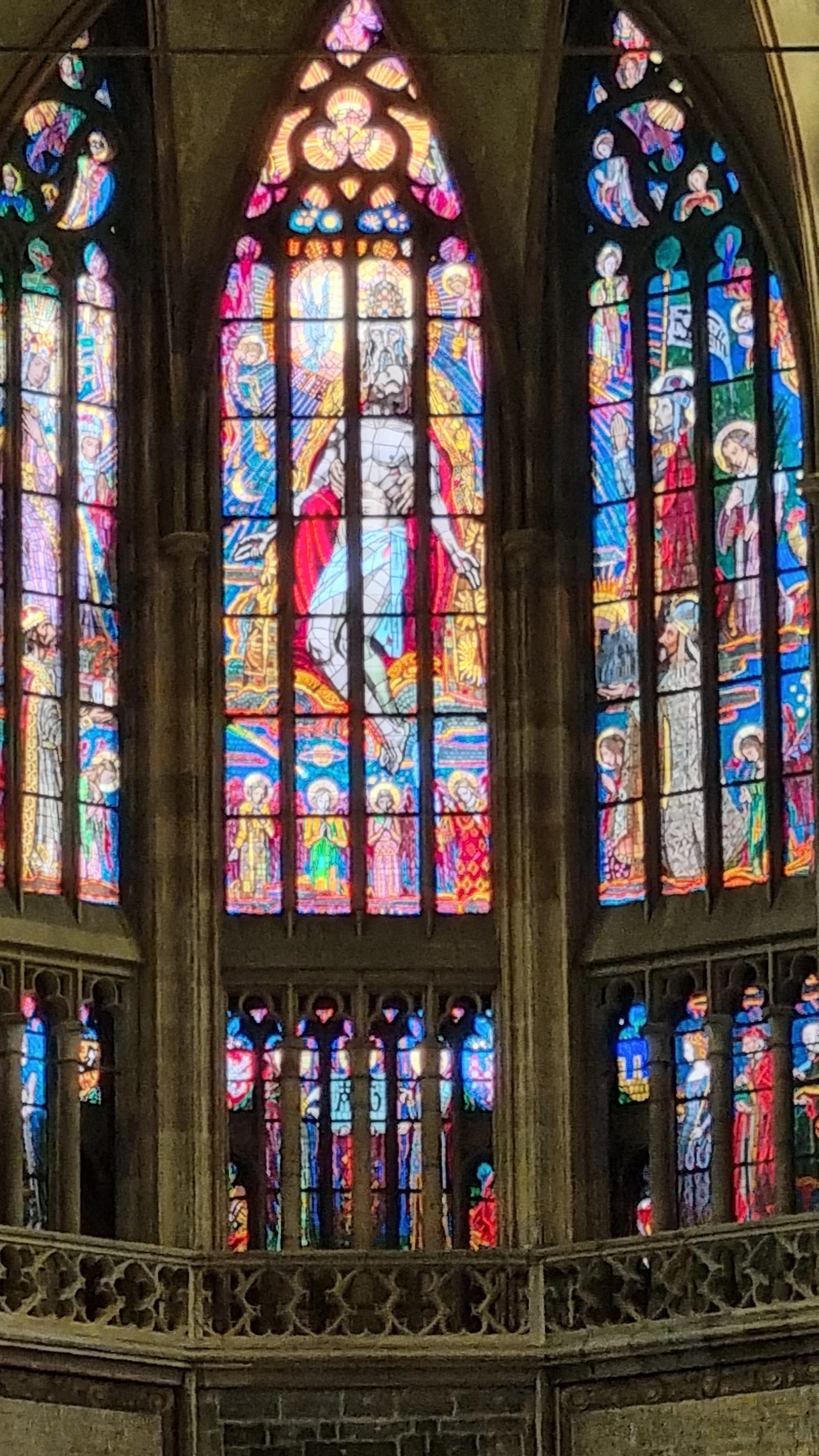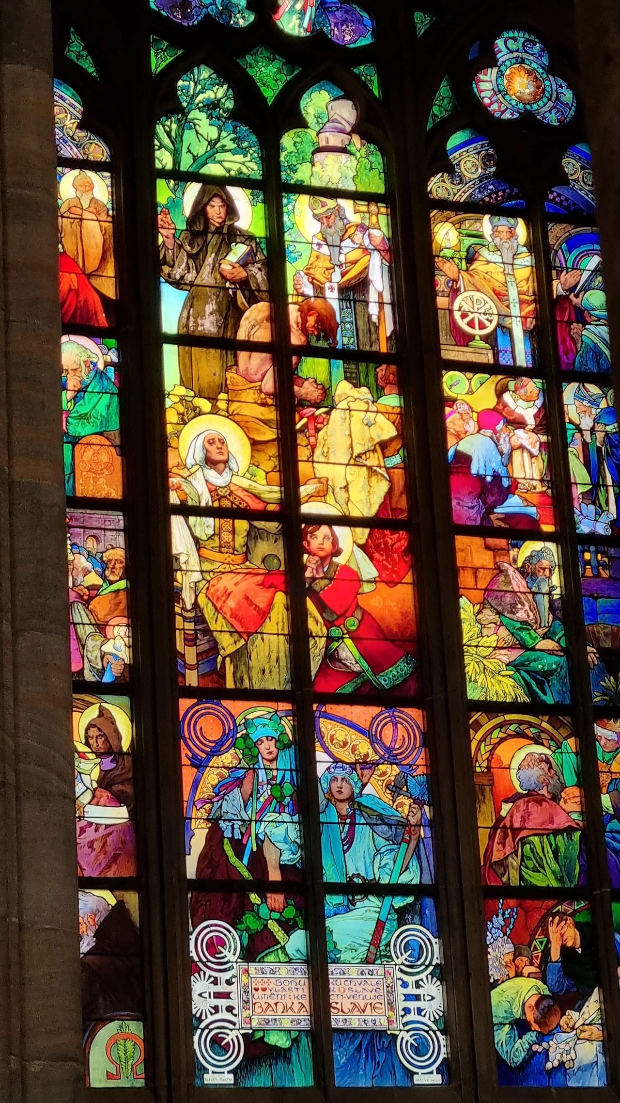 성당의 아름다움, 고유함이라 한다면, 스테인드 글라스는 빠질 수 없다. 성 비투스 성당의 스테인드 글라스는 체코를 대표하는 알폰스 무하의 작품으로 더욱 유명하다. 아폰스 무하의 스테인드 글라스는 유리 조각을 이어붙이는 방식이 아니라 유리에 직접 그림을 그리고 가마에 구워내어 만들었다고 한다. 오랜 시간에 걸쳐 완성된 만큼 다양한 시대의 스테인드 글라스를 감상하는 재미도 있다.