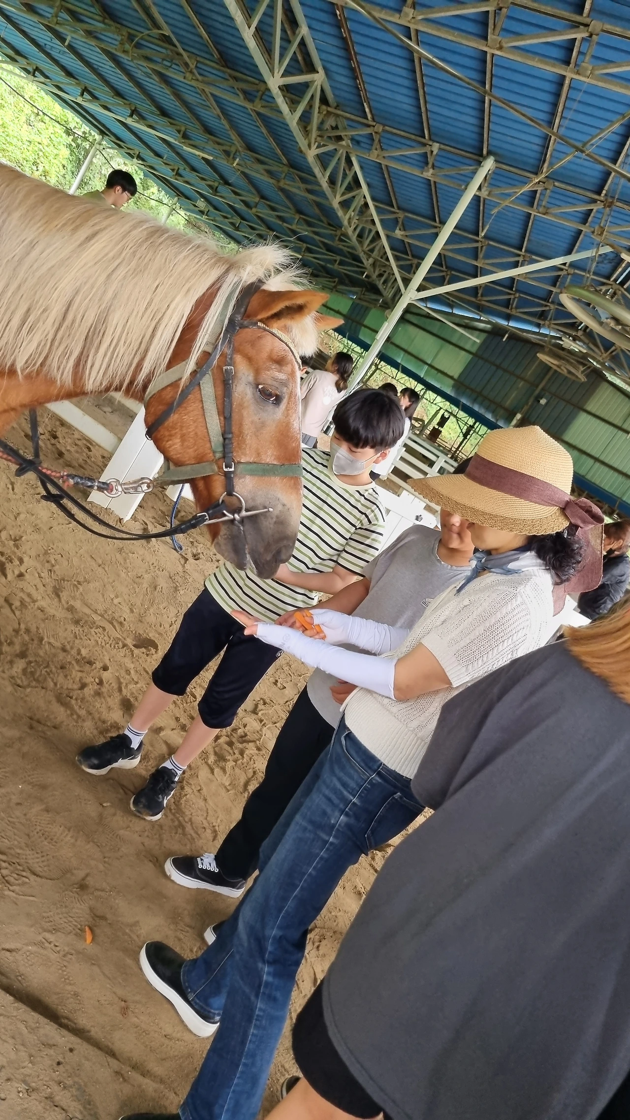 말의 특성에 대해 배우고 난 뒤, '사랑해, 예쁘다' 쓰다듬으며 교감하고, 말고삐를 잡고 나란히 걸어도 보고, 먹기 좋게 자른 당근을 손바닥에 펼쳐 먹이주며 말의 콧김과 입김도 느껴보았습니다. 인구가 급감하고 소멸 위기에 있는 지역의 농촌을 찾아 체험하고 배우는 것은 아이들 뿐만 아니라 지역민에게도 새로운 활기가 되었습니다.