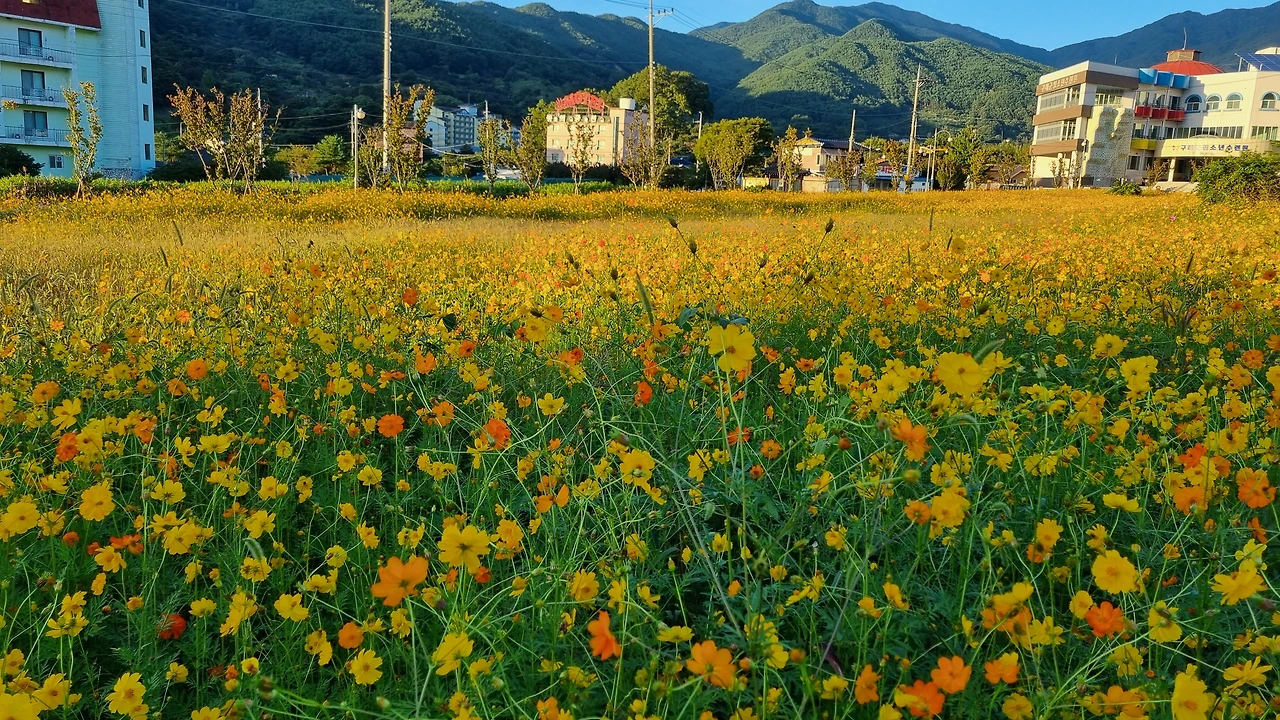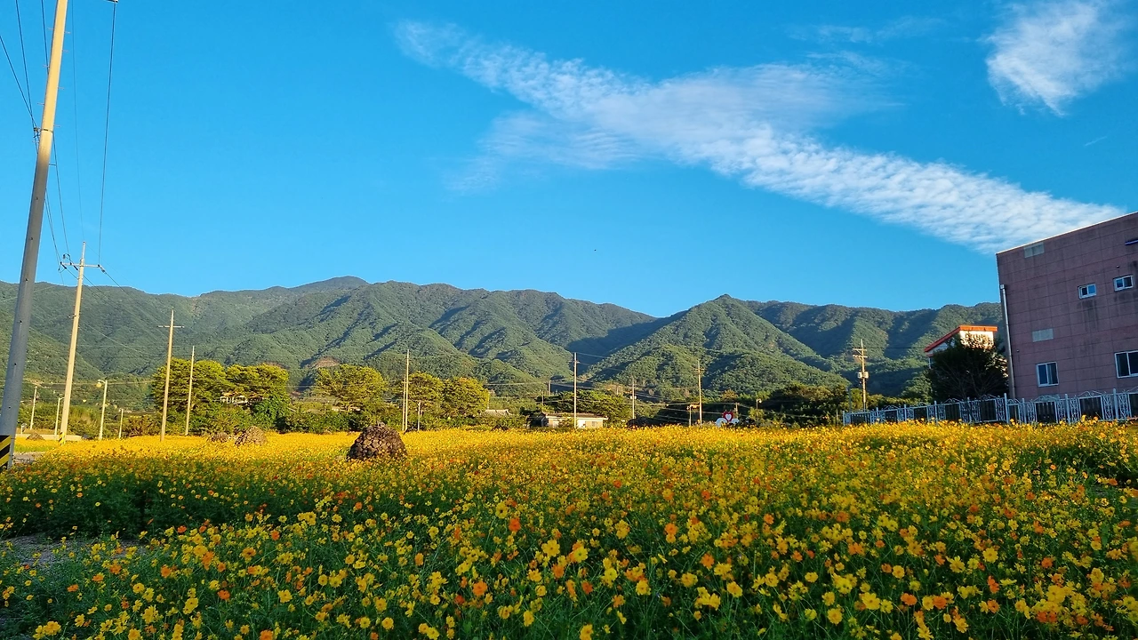 게스트하우스가 있는 곳에 도착하니 노란 코스모스(?) 밭이 넓게 펼쳐져 있었다. 해가 뉘엿 넘어가기 직전, 부드럽고 온화한 햇살이 내려앉은 꽃밭은 이른 점심으로 허기진 우리를 '어서 오세요. 환영합니다' 하며 환대하는 듯하였다.