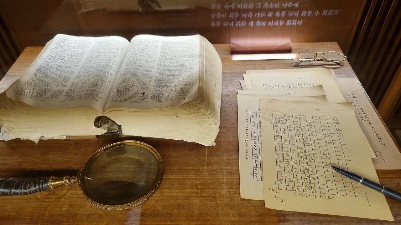 손때 묻은 두툼한 국어사전, 안경, 손돋보기, 수기로 쓰인 원고, 펜.