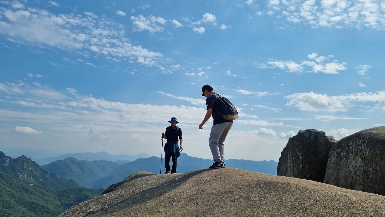 아슬아슬 배바위(화강암) 위에서 바라본 하늘과 산이 그려내는 풍경은 정말 아름다웠다.