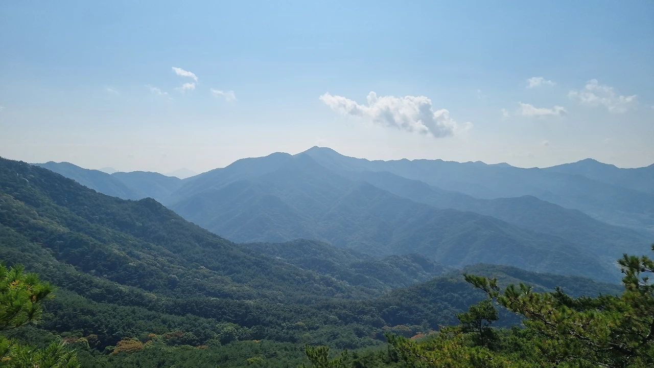 관룡산 오르는 중 화강암 바위에 서서 바라본 산과 하늘