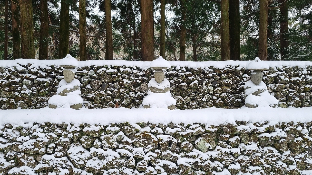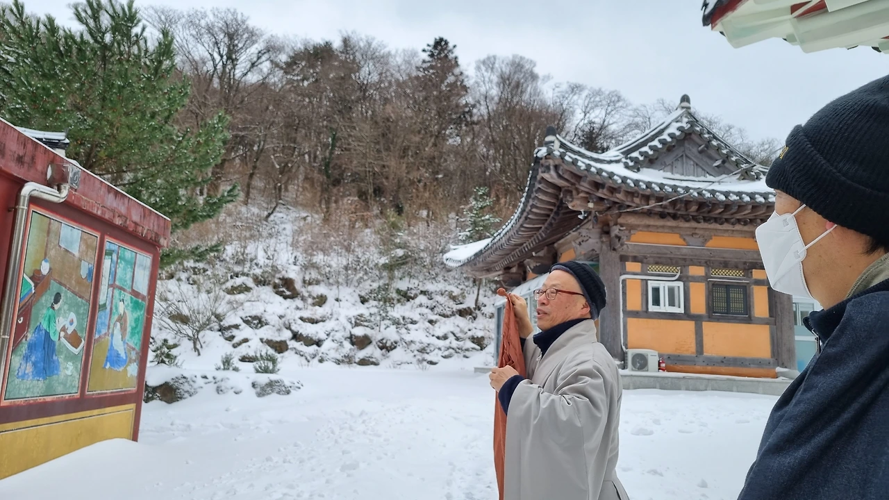 "저기 부처님 봐봐. 눈옷을 입고 있으니 더 귀엽고 인자해 보이지."