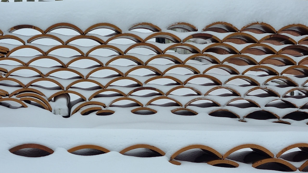 "저 돌담 봐봐. 사이사이 하얀 눈이 있으니까 따뜻해 보이지 않아."