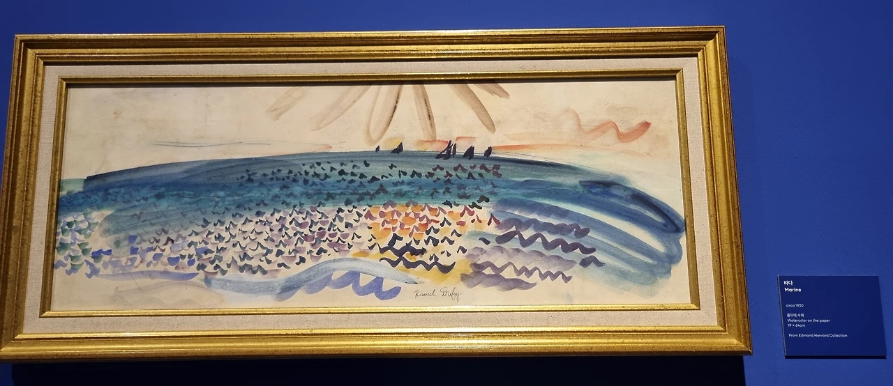 라울 뒤피는 인생의 대부분을 파리에서 보냈지만, 프랑스 남부와 프로방스 지역에 매료되었다. 그는 그곳의 항구와 바다에 대한 무한한 애정을 갖고 있었던 듯하다. 그의 바다 그림을 바라보노라면 내부에서 유쾌한 에너지가 쏟아 오르는 것 같다. 한 아이 모습이 떠오른다. 바다를 향해 캔버스를 놓고 수채물감이 색의 경계를 넘나드는 팔레트를 펼친 채, 큰 붓을 들고 대담하게 선을 긋는 아이. 아이의 눈에 펼쳐지는 넓은 바다는 찬란한 태양빛에 나풀거리며 초록빛으로 황금빛으로 붉은빛으로 파도친다. 바다 위를 갈매기가 날고 요트와 화물선이 유유히 흐른다. 하늘과 바다의 경계가 사라진다. 아이는 순식간에 캔버스를 채우고 난 뒤 모래사장에 앉아 모래성을 쌓는데 온통 정신이 팔렸을 것 같은. 대담하게 툭 던져진 것 같은 그림인데 왜 이렇게 속이 뻥 뚫리듯 시원한 느낌이 드는 걸까. 건강하고 유쾌한, 발랄하고 경쾌한, 기쁨과 희망의 에너지가 넘쳐난다. 당당하게 바다 위를 가르는 저 화물선은 수평선 너머 희망에 닿아 있다. 아마도 '라울 뒤피'는 적어도 아이 같은 맑은 영혼을 가진 사람이 아니었을까!