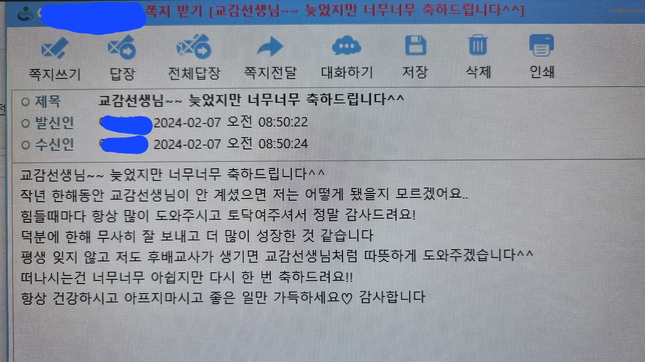 시간이 강물처럼 흘러 교감 역할을 하며 지낸 2년이 훅 지난간 느낌이다. 이런 저런 사건들이 많았지만 그때마다 좋은 사람들이 곁에 있어 무탈하게 터널을 잘 빠져나올 수 있었다. 그리고 오늘 2024.2.6.화요일 교장 발령을 받았다. 정신이 하나도 없는 가운데 여기 저기서 걸려온 축하 전화를 받으며 하루가 흘렀다. 오후에는 교무실 주무관님이 학교 앞 빵집에 달려나가더니 케이크를 사와서 "제일 먼저 축하해드리고 싶었어요!" 하며 또 한번 나를 감동시킨다.