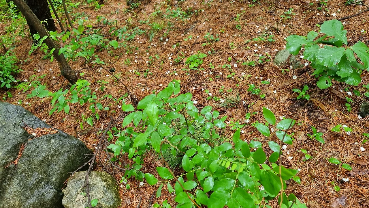 비바람에 떨어진 때죽나무 꽃은 땅 위에서 하얀 별꽃으로 다시 피어납니다. 소나무 거친 줄기에 기대어 덩굴식물들이 키를 키우고 있습니다. 분홍꽃 진 자리에 초록색 산복숭아 열매가 조롱조롱 귀엽게 매달렸습니다. 계곡물이 졸졸거리고 산을 찾은 사람들 발걸음도 가볍습니다. 자연이 그려내는 풍경은 한없이 순해지게 합니다.