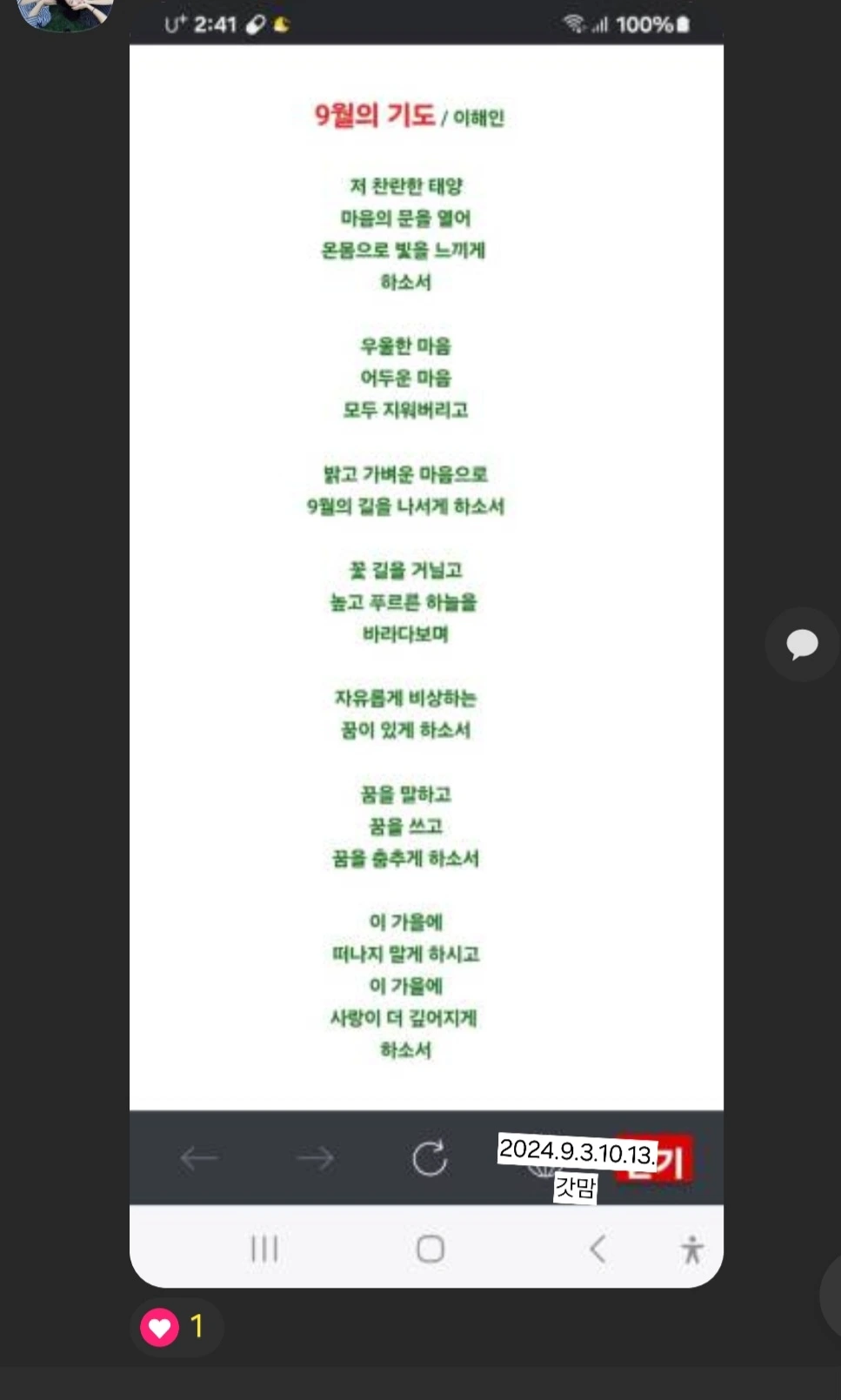 나에게는 매일 일용할 말씀을 보내주시는 분이 계시다. 나의 대모(God mom)이시다. 그분과 같은 공간에서 일하며 사랑과 긍정의 에너지를 참 많이 받았었다. 2022년 세례를 받으면서 나의 영적 엄마가 되셨다. 그 이후로 매일매일 우리는 카톡을 주고받으며 서로의 하루를 응원하고 있다. 매일 '안녕'을 물어주는 사람이 존재한다는 것은 크나큰 축복이다. 쉰이 넘어도 엄마가 이 세상에 없다고 생각하면 '고아'가 된 듯 외로움이 몰려오는 순간들이 있다. 채워지지 않는, 원초적인 분리에서 오는 외로움을 나의 영적맘이 가랑비에 옷 젖듯 살푼살푼 적셔주고 있다.