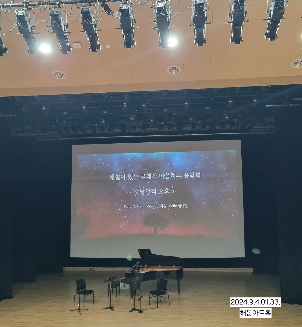 그렇다. 나도 낭만이라면 로맨틱이라는 단어를 떠올리고 풋풋한 남녀가 사랑하는 장면이 연상된다. 로맨틱이 로맨스와 연결되니 자연스러운 일이다. 음악회 부제가 <낭만적인 오후>이다. 아직은 여름의 쨍쨍한 햇살이 뜨거운 오후 2시, '낭만'이라. '풋풋'하고 기분 좋은 웃음소리가 나도 모르게 피어난다. 바쁘게 돌아가는 일상에서 '낭만'은 '저 멀리' 있는, 탐하기에는 '호사'같이 느껴지기도 한다. 그래서 더욱 <낭만적인 오후>라는 부제가 음악회가 시작되기 전부터 마음에 든다.