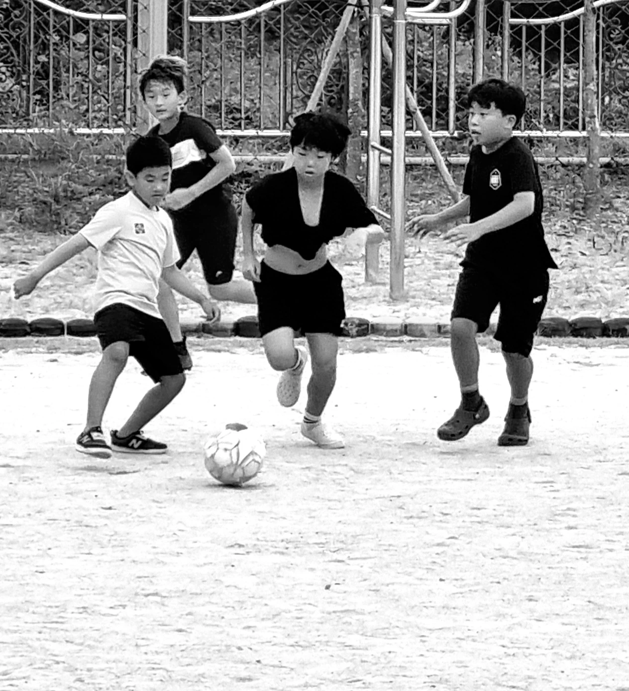 우리 학교 5학년 남자아이들은 축구에 진심이다. 점심 쉬는 시간 운동장은 그들의 차지다. 가끔 몇몇 4학년 남자아이들이끼기도 하는데 들러리 신세를 면치 못하는 것 같다. 운동장이 조금만 더 넓었어도 한쪽 구석을 차지할 수 있을 것 같은데 산 허리로 학교를 이전하다 보니 어쩔 수 없었던 것 같다. 5학년 남자아이들이 으레 운동장을 차지하니 4학년들은 학교 건물과 화단 사이 보도블록 공간에서 아쉬운 대로 공을 차며놀았다.