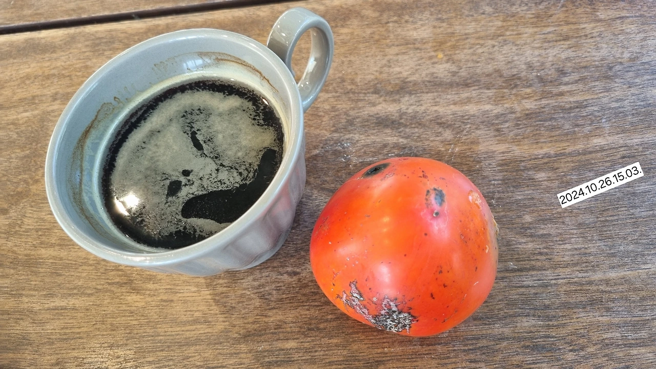 바닷가 마을을 지나며 감 하나 손에 넣어 카페에 가져왔다. 무심히 커피잔 옆에 놓으니 서로의 존재가 더욱 또렷해진다.