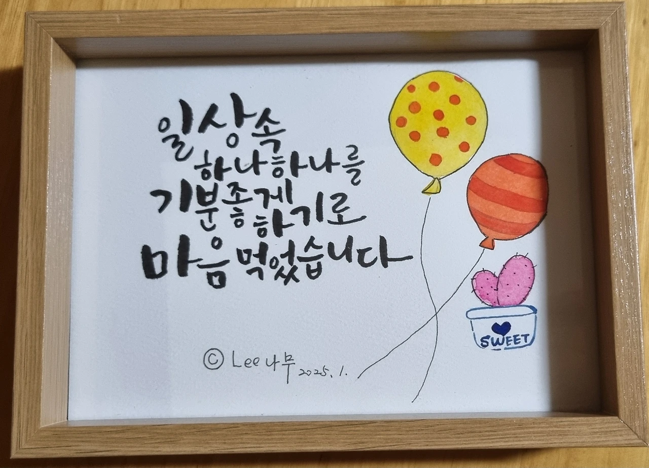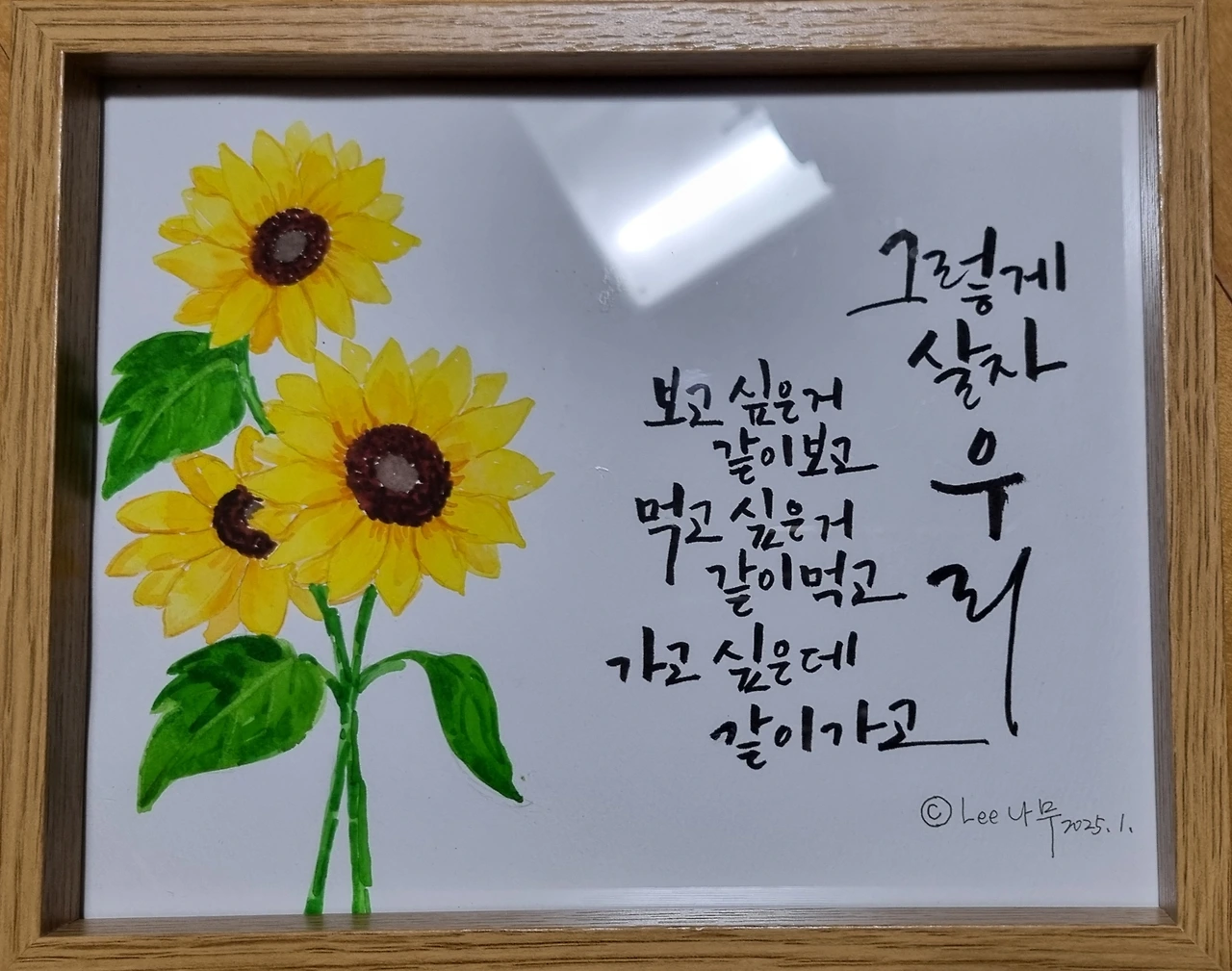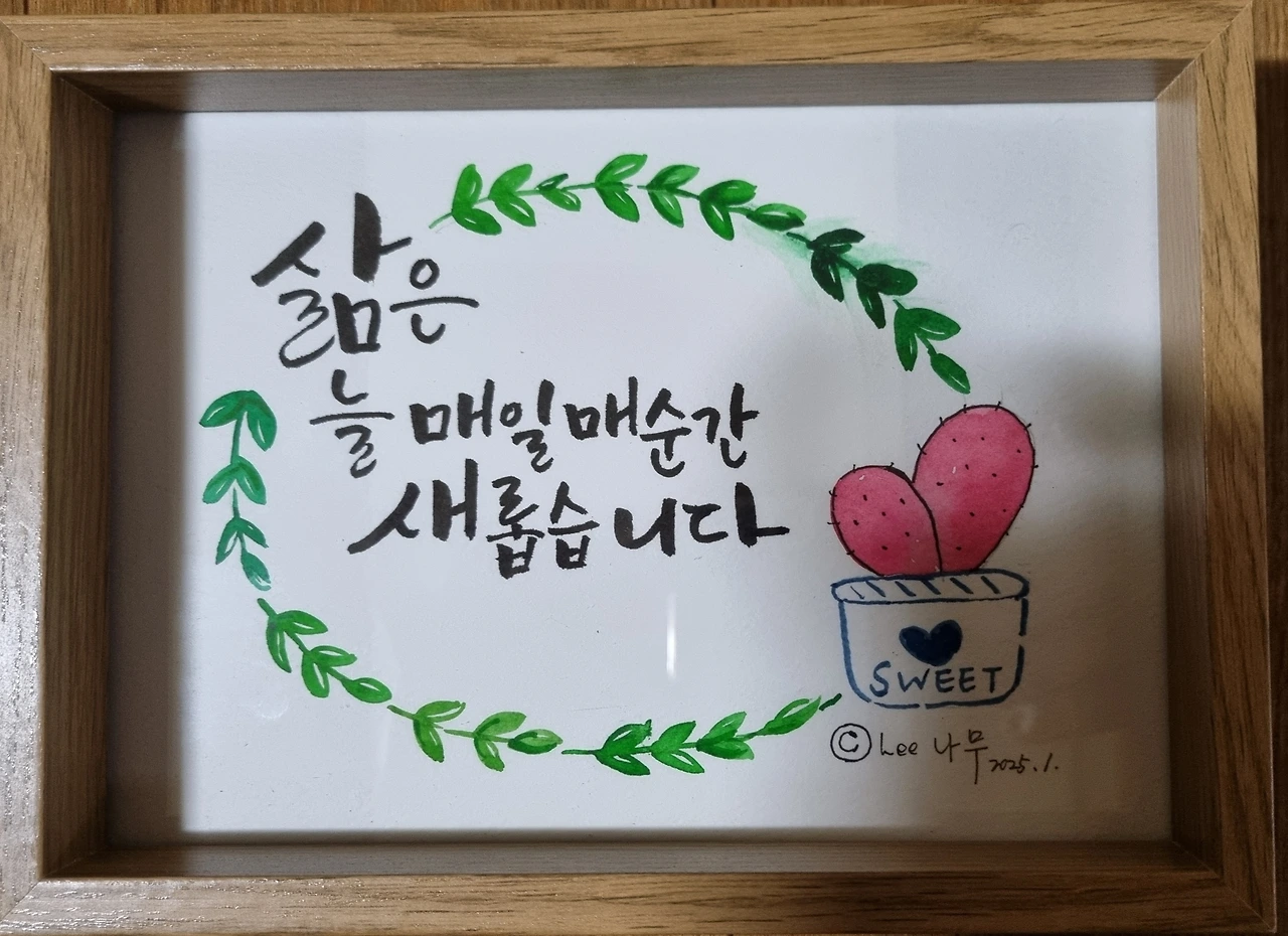 하기 싫은 마음이 들다가도 "일상 속 하나하나를 기분 좋게 하기로 마음먹었습니다"라는 문장을 읽으면 거짓말처럼 기분이 나아지고 살아서 할 수 있는 모든 일상이 감사하게 느껴지는 마법을 경험한다. 작은 언니와 동생도 나와 같은 언어의 신비를 경험하길 바라는 소망을 담아 캘리그래피를 만들었다. 큰언니는 정토회에 열심이라 "삶은 늘 매일 매 순간 새롭습니다"는 문구로 구성했고, 형부는 해바라기 그림을 주문했기에 해바라기를 그려 넣었다. 이로써 나의 작은 소망 하나 이룬 셈이다. 사랑을 담아 선물을 직접 만드는 일은 큰 기쁨이다.