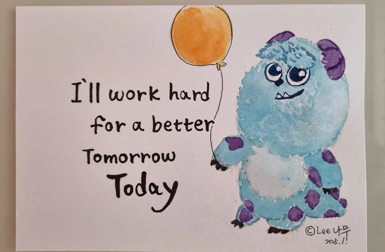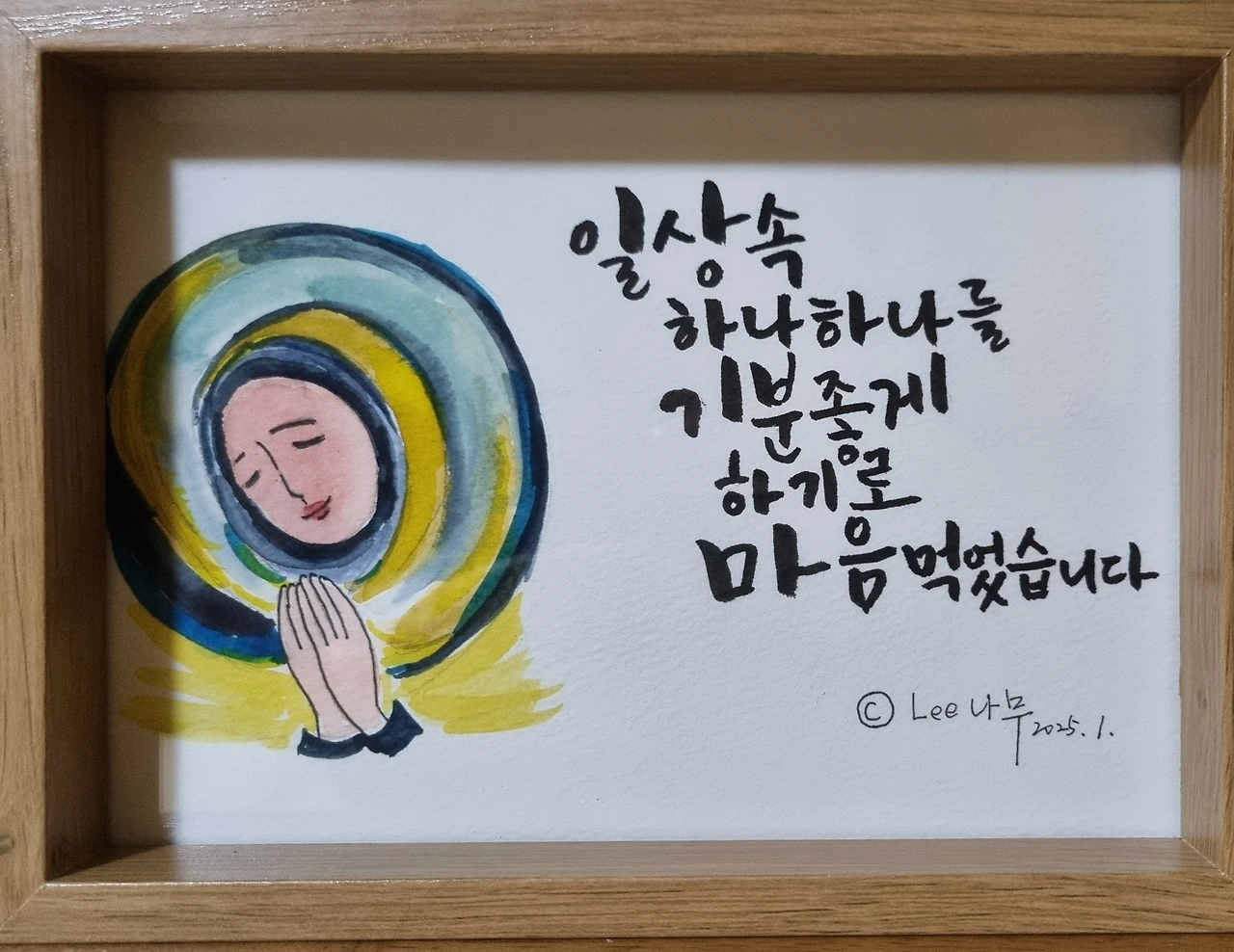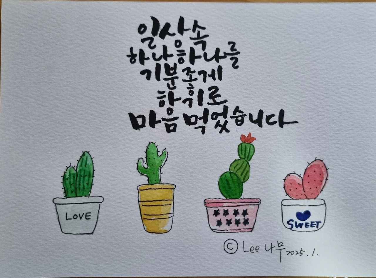 하기 싫은 마음이 들다가도 "일상 속 하나하나를 기분 좋게 하기로 마음먹었습니다"라는 문장을 읽으면 거짓말처럼 기분이 나아지고 살아서 할 수 있는 모든 일상이 감사하게 느껴지는 마법을 경험한다. 작은 언니와 동생도 나와 같은 언어의 신비를 경험하길 바라는 소망을 담아 캘리그래피를 만들었다. 큰언니는 정토회에 열심이라 "삶은 늘 매일 매 순간 새롭습니다"는 문구로 구성했고, 형부는 해바라기 그림을 주문했기에 해바라기를 그려 넣었다. 이로써 나의 작은 소망 하나 이룬 셈이다. 사랑을 담아 선물을 직접 만드는 일은 큰 기쁨이다.