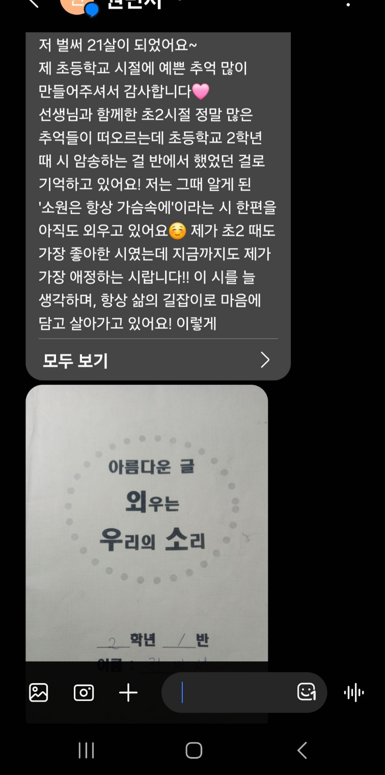 12년 전 초등학교 2학년이었던 아이는 21살 대학생이 되었어요. 해마다 스승의 날이면 잊지 않고 따뜻한 문자가 나의 마음을 두드린답니다. 까맣게 잊고 있었던 12년 과거 모습이 희미하게 눈앞에 일렁입니다. 그때 우리가 "아름다운 글 외우는 우리의 소리"라는 좋은 시, 좋은 글을 모은 '모음집'을 만들고 한 권씩 다 나누어 가졌지요. 그리고 1주일이든 2주일이든 자신의 속도에 맞게 한편씩 암송했습니다. 암송은 눈으로 보고 소리 내어 읽고 귀로 듣는, 눈과 입과 귀가 서로 응하기에, 눈으로만 묵독하는 것보다 여러 가지 장점이 많아서, 아이들과 해보기로 했지요.