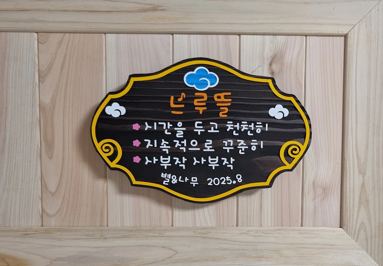 쉼터의 현판을 소박하게 만들었다. 한 달 넘게 생각을 이어가고 있었다. 결국 처음 생각에서 더 나아가지 못하고 '느루뜰'로 결정했다. 순우리말 '느루'가 가진 뜻이 시골 생활을 시작하며 명심하고자 했던 우리의 지향을 잘 담고 있기 때문이다. '느루'는 '시간을 두고 천천히', '지속적으로 꾸준히', '무리하지 않고'라는 뜻을 갖고 있다. 무리하지 않고 대신 사부작사부작으로 바꾸었다. 나는 일을 두고 못 보는 타입이다. 일을 보면 나도 모르게 서두르게 된다. 시골 농사일은 기다림의 미덕이 필요하다. 자연의 섭리에 따라야 할 것이다. 오래 지속하기 위해서 서두름은 덕 될 것이 없다. '사부작사부작'은 세 가지 중에서 스스로 가장 명심하고 실천하고자 노력할 점이다.