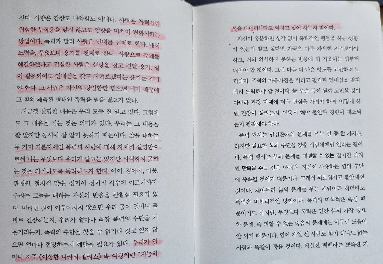 삶을 사랑하건, 다른 사람이나 동물, 꽃을 사랑하건 모든 종류의 사랑에 적용되는 기본 원칙이 있다. 내 사랑이 적절하고 상대의 욕망과 본성에 맞을 때만 나는 사랑할 수 있다. 적은 물을 필요로 하는 식물이라면 그 식물에 대한 사랑은 필요한 만큼만 물을 주는 것으로 표현된다. '식물에 무엇이 좋은지'에 관련된 선입견이 있다면, 가령 최대한 물을 많이 주는 것이 모든 식물에 좋다고 생각한다면 나는 식물을 해칠 것이고 죽일 것이다. 나에게는 식물이 사랑받아야 할 방식대로 식물을 사랑할 능력이 없기 때문이다. 그러므로 단순히 사랑만 하는 것으로는, 다른 생명체가 '잘되기를 바라는' 것만으로는 충분하지 않다. 식물이, 동물이, 아이가, 남편이, 아내가 뭘 필요로 하는지 모르고 무엇이 상대에게 최선인지 정한 내 선입견과 상대를 통제하려는 욕망을 버릴 수 없다면 내 사랑은 파괴적이다. 내 사랑은 죽음의 키스인 것이다. <우리는 여전히 삶을 사랑하는가>, 28쪽.