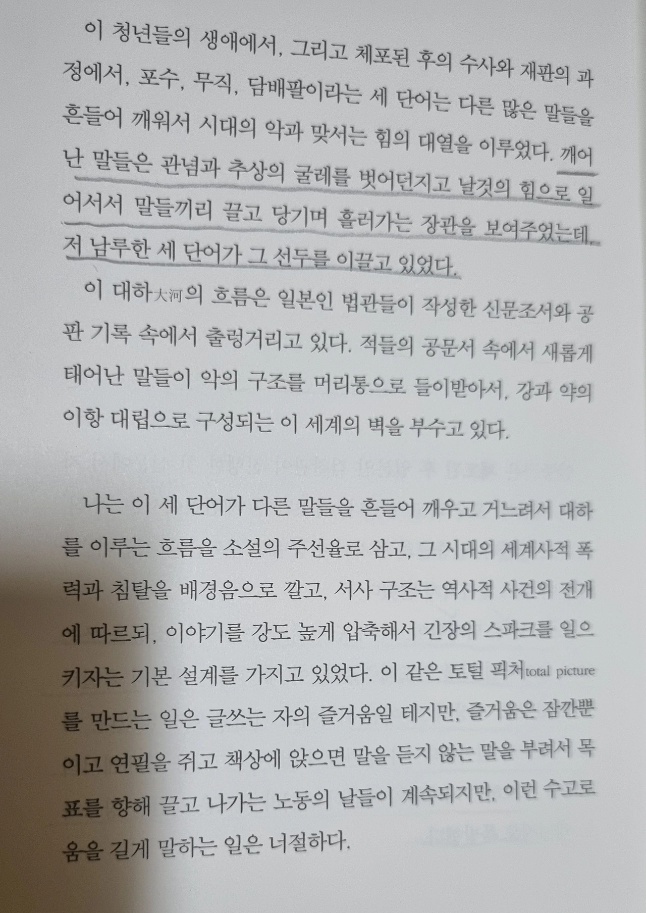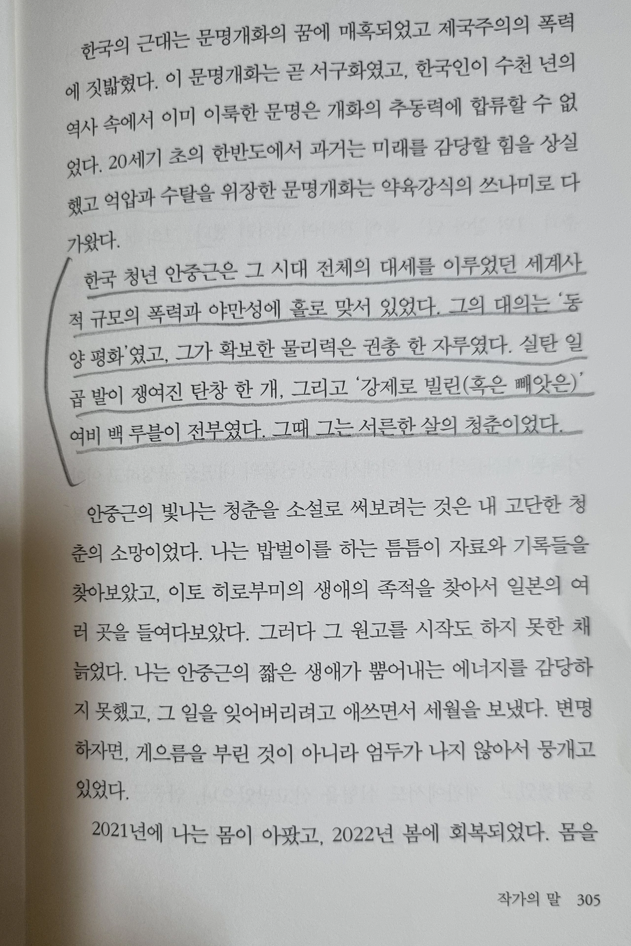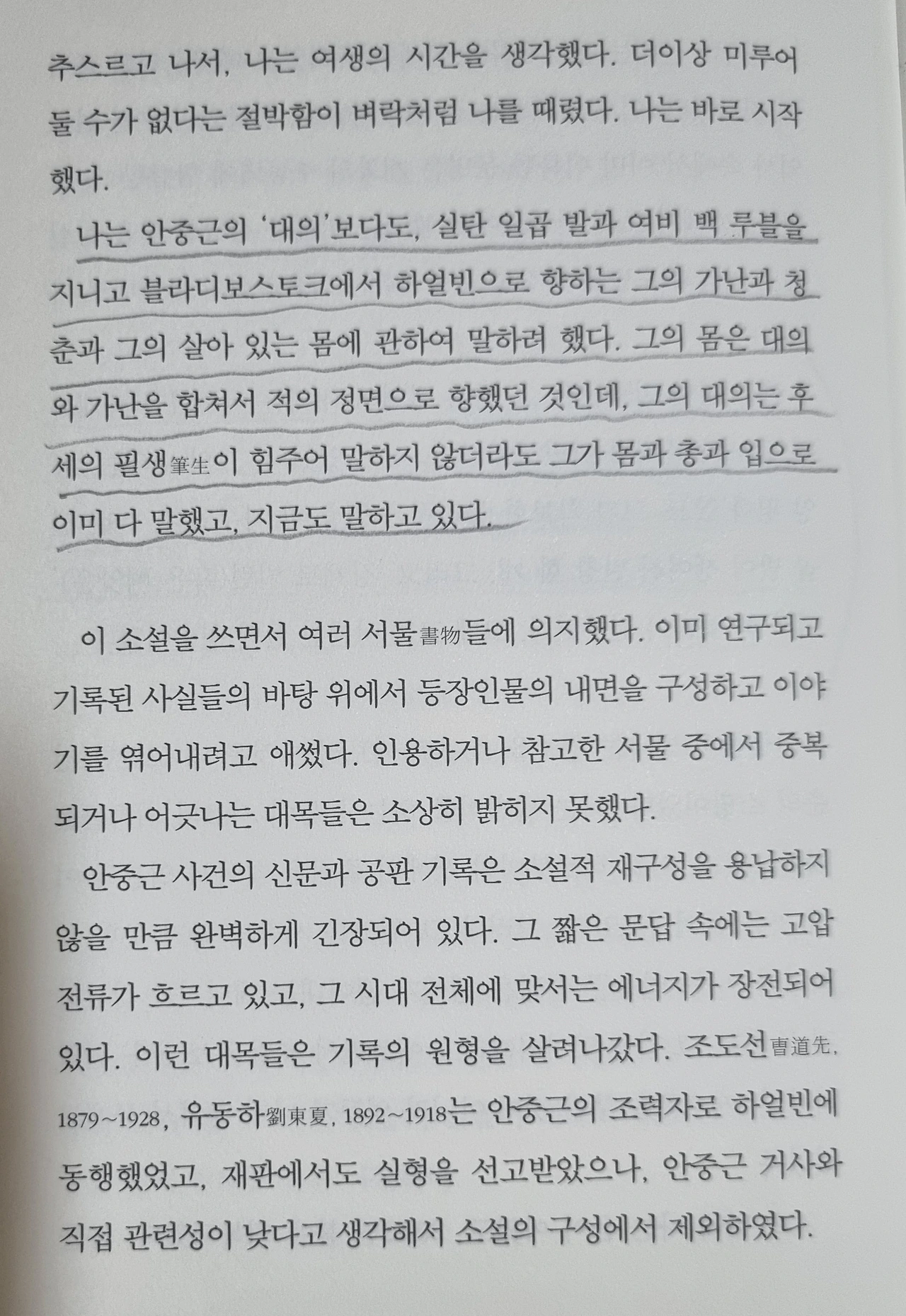 나는 안중근의 '대의'보다도, 실탄 일곱 발과 여비 백 루블을 지니고 블라디보스토크에서 하얼빈으로 향하는 그의 가난과 청춘과 그의 살아 있는 몸에 관하여 말하려고 했다. 그의 몸은 대의와 가난을 합쳐서 적의 정면으로 향했던 것인데, 그의 대의는 후세의 필생(筆生)이 힘주어 말하지 않더라도 그가 몸과 총과 입으로 이미 다 말했고, 지금도 말하고 있다. 306쪽, 작가의 말 -