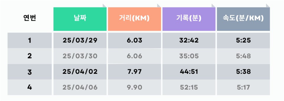 2025년 3월 29일 첫 번째 러닝을 실시한 이후로 약 2주간 집중적으로 훈련했다. 거리를 조금씩 늘리는 훈련을 지속했고, 덩달아 기록이 함께 쌓였다. 속도에서는 그리 큰 차이는 보이지 않았다.