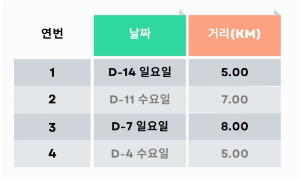 어떠한가. 조금 현실적으로 보이지 않는가. 경기도에서 1시간이나 떨어져 있는 서울의 직장을 매일 출퇴근하고, 세 살배기 딸아이를 육아하는 입장에서 내가 소화할 수 있는 최소한의 러닝 일정이었다. 연습에 많은 시간을 할애할 수 없었다는 사실도 맞고 모두 핑계라는 소리도 맞다.