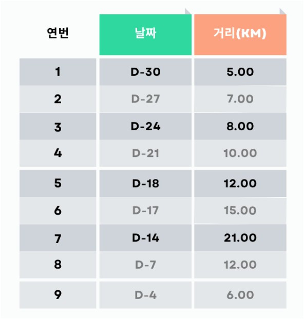 대회를 일주일 앞두고 거리를 줄여 부상을 방지하고 몸 상태를 최대한 끌어올리는데 집중하는 게 나을 것이라 판단한다. 대회 직전 무리하게 21km를 뛰었다가 사달이 날 뻔했던 나의 훈련 일정을 참고해 여러분만큼은 한층 피치를 끌어올렸다가 차분히 내리는 연습을 해냈길 바란다.