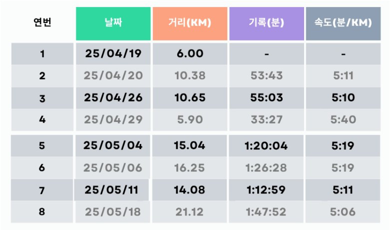 10km 마라톤을 완주한 후, 6일을 내리 쉬었다. 내겐 몸이 회복할 시간이 필요했다. 대회 날, 긴장하며 달리기를 했던 탓에 왼쪽 발목에 무리가 갔었던 게 흠이었다. 그렇게 4월 19일이 되어서야 나는 헬스장에서 첫 번째 러닝을 시작한다. 이날 6km 러닝을 시작으로 이후 시간이 날 때마다 연습했다. 그 연습량 아래와 같다. (1회 차 러닝은 앱 활용법을 제대로 몰라 기록을 못했다.)