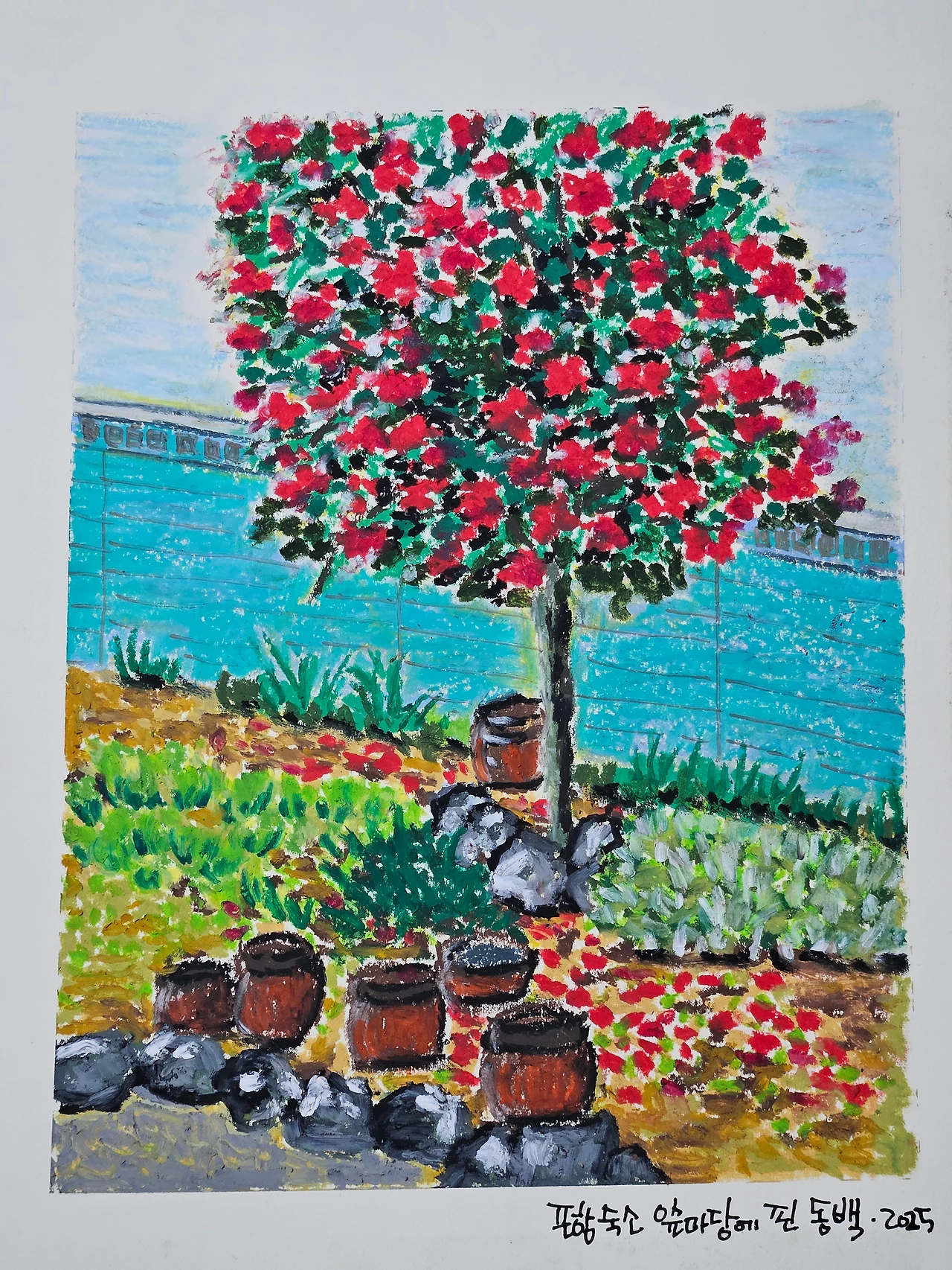 마당 안에 나무가 한 그루 있고, 싹이 오르기 시작하는 키 작은 식물들이 있고, 붉은 꽃잎이 구슬처럼 마당에 흩어져 있었어요.