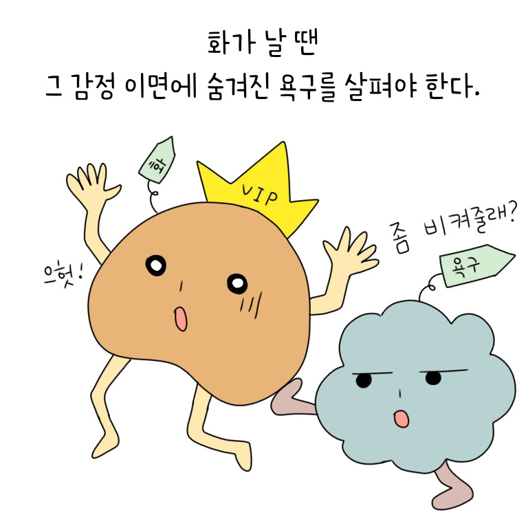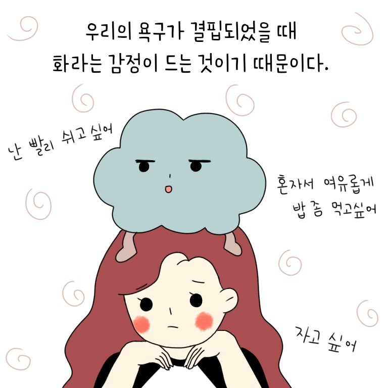 욕구란 "무엇을 얻거나 무슨 일을 하고자 바라는 일"이라는 사전적 정의가 있다. 화, 짜증, 분노와 같이 부정적인 감정의 이면에는 좌절된 욕구가 숨어 있다. 감정은 우리의 욕구를 알려주는 지표와도 같다. 그러기에 감정을 회피하거나 숨겨서는 결코 우리의 욕구를 알 수 없다. 욕구를 외면하는 것은 나 자신을 외면하는 것이다. 나 자신을 반복적으로 외면하다 보면 결국에는 내가 진짜 원하는 것을 나도 모르게 된다. 육아를 하면서 번번이 찾아오는 부정적인 감정에 자책하는 대신, 그 감정 뒤에 숨겨진 나의 욕구를 먼저 인정해줘 보는 건 어떨까?