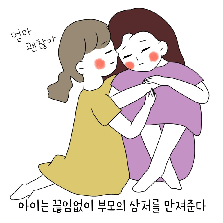 육아를 통해 성장한다는 말도 이 말과 같다. 아이는 쉬지 않고 나의 상처 받은 지점을 건드린다. "엄마, 엄마의 상처를 봐요."라고 말하면서. 정신을 바짝 차리고 곰곰이 생각해보자. 나의 상처 받은 지점은 어디일까? 어느 순간 화가 많이 나지? 분명 거기에는 상처 받은 어린 내가 기다리고 있다. 당신이 손 내밀고 안아줄 때까지.
