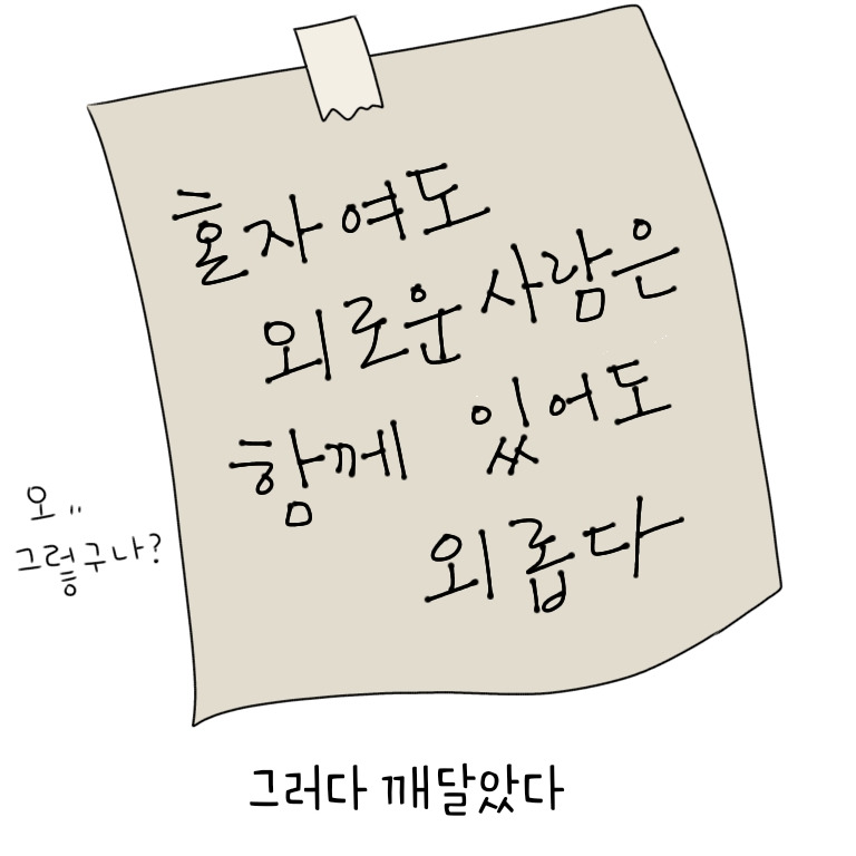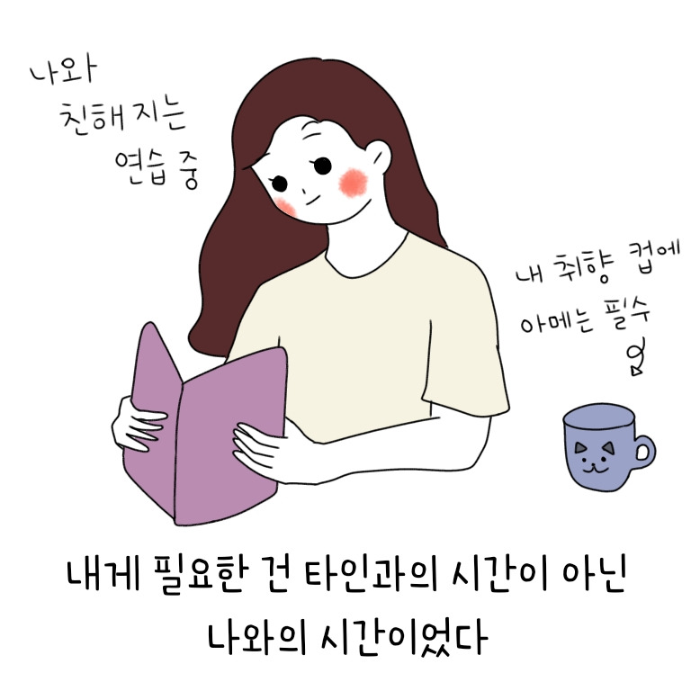 출산 직후 줄곧 아기와 나는 24시간 365일 함께였지만 인생에서 지독히 외로웠던 시간이었다. 아이에게 온전히 집중하며 나라는 한 사람에서 엄마로 다시 태어나는 통과의례였을까. 나에겐 무엇보다도 다시금 나와 친해지는 연습이 필요했다. 몇 년 간 아이에게만 집중했던 시선을 나에게도 나누어줄 것. 나를 다시금 알아가는 시간은 밋밋한 내 삶에 활력을 불어넣었다. 지금 지독히도 외롭다면 하루에 잠깐이라도 나를 위한 시간을 마련해 보는 건 어떨까? 자신과 친한 사람은 혼자여도, 함께여도 외롭지 않다.