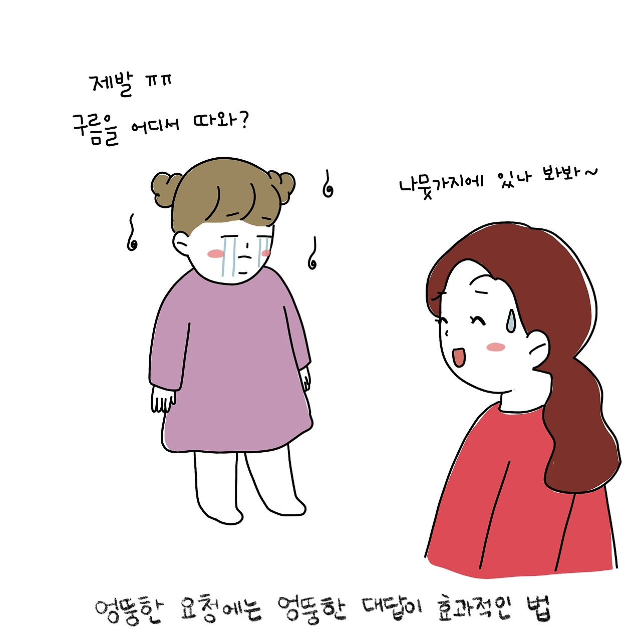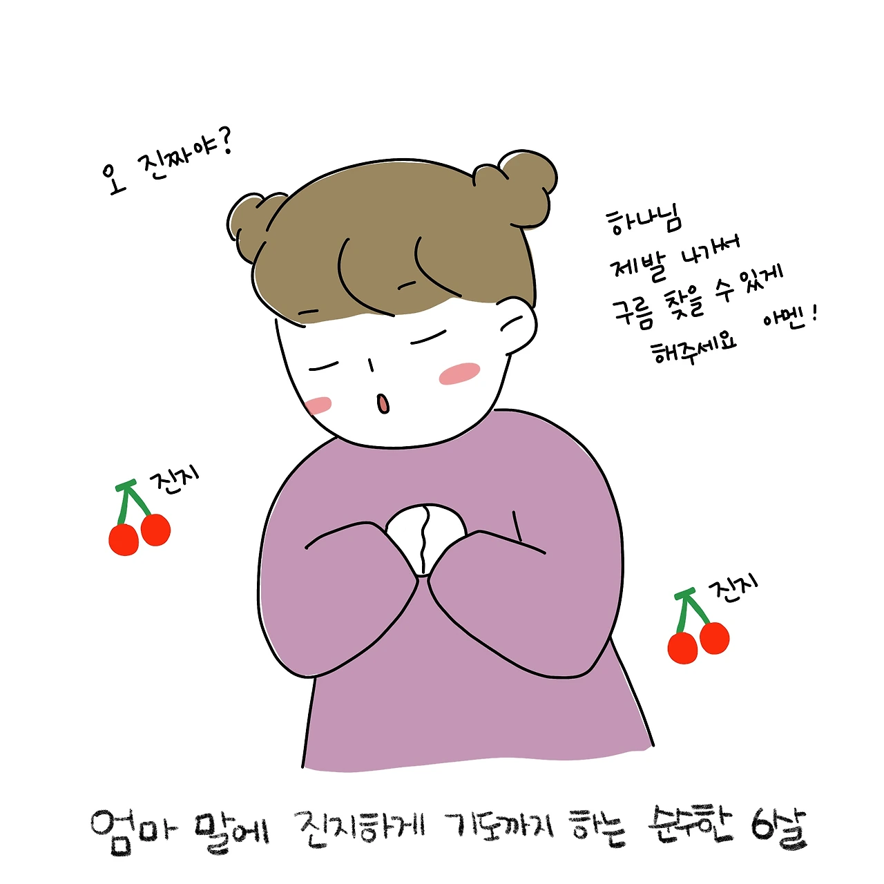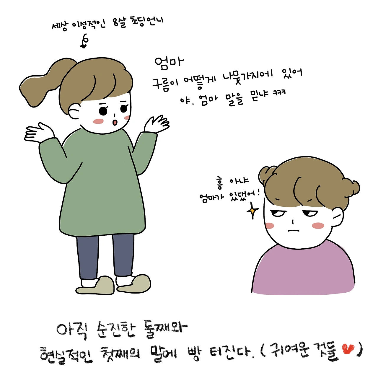 "그럼 나가서 네가 구름 좀 갖다 줘^^" 엄마의 말에 진지하게 기도까지 하는 동생을 본 초딩 언니 왈, "엄마 구름을 어떻게 가져와. ㅋㅋㅋㅋ" 짜식... 좀 컸다고 이제 거짓말이 안 통하네. 벌써 세상 물정에 눈을 뜬(?) 일콩이와, 아직 순수 그 자체인 이콩이의 모습에 엄마는 또 웃게 된다.