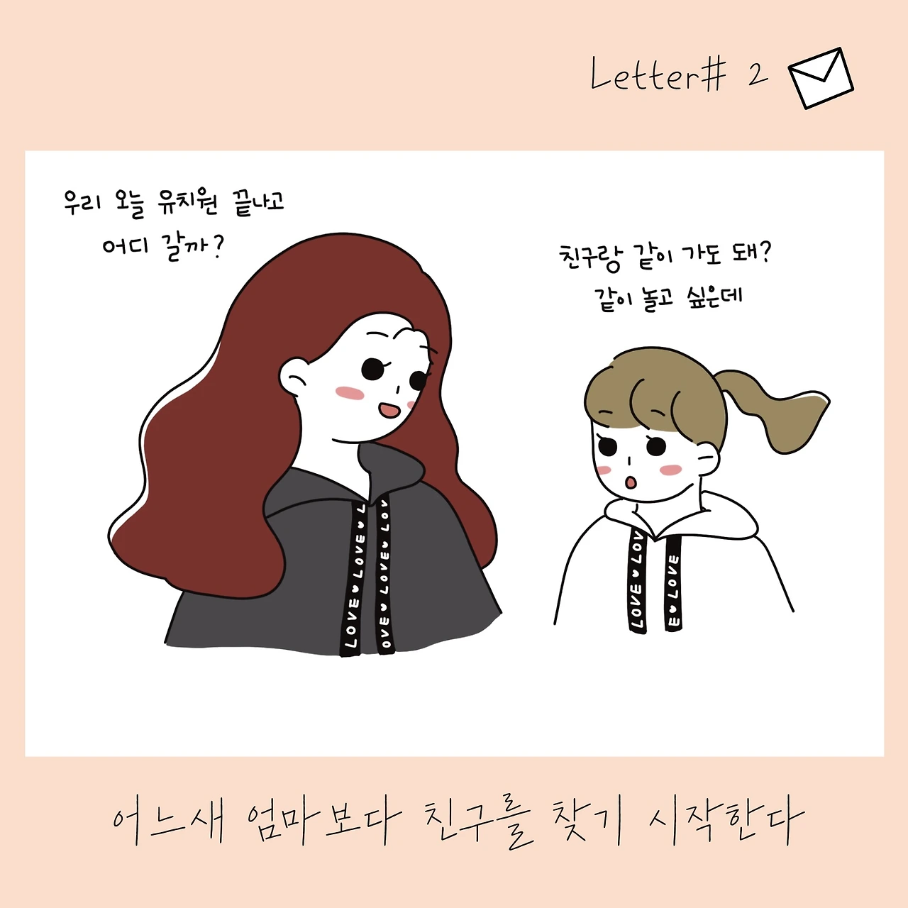 엄마랑 노는 게 세상에서 제일 신나고 재밌다는 아이는 훌쩍 자라 친구들이랑 노는 게 정말 재밌다고 재잘거리는 꼬마 숙녀가 되었다.