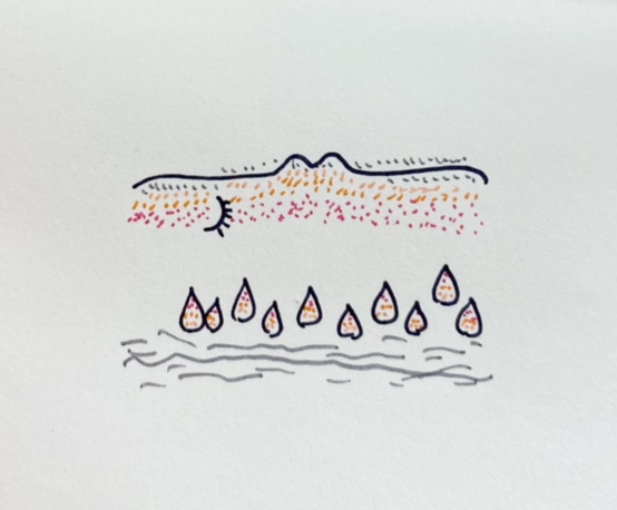 땅은 아픔을 본 작은 분노들이 또 말랑거리기 시작했어요. 작은 분노들은 땅을 울게 만들어, 땅 위에 물 웅덩이가 고이게 했어요. 물 웅덩이는 바다와는 다른 고요함이 있었고, 사람들은 그 아름다움을 보며 일을 잠시 멈췄어요.