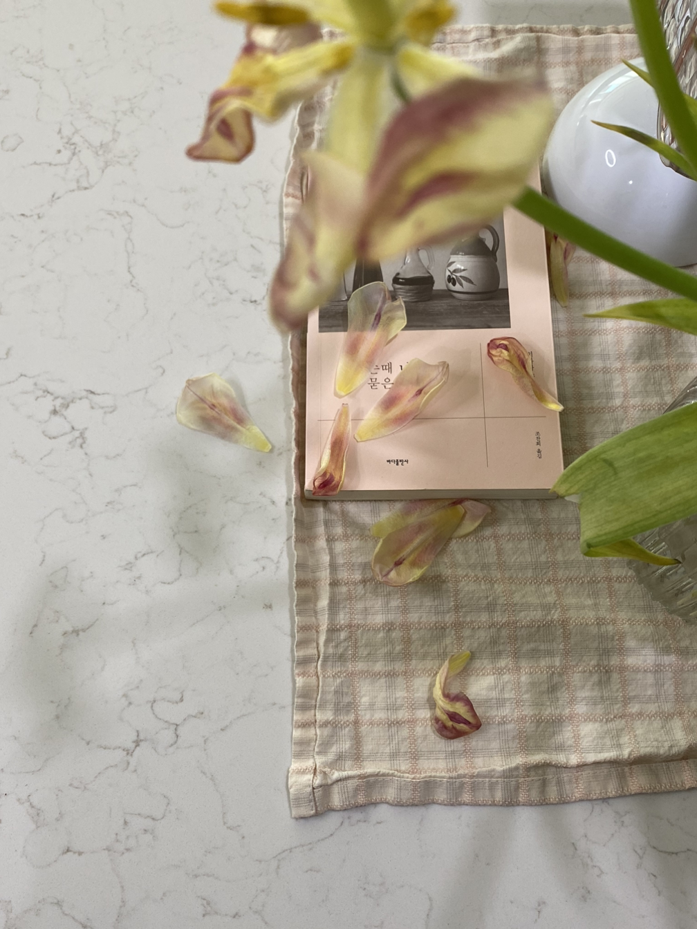 힘이 없어져 결국 꽃봉오리에서 이탈해 떨어진 꽃잎들도 생겨났다. 그 전 날 읽으려고 올려둔 책에 꽃잎들이 내려앉았는데 책의 색깔과 어우러져 그 순간도 이쁜 거다.