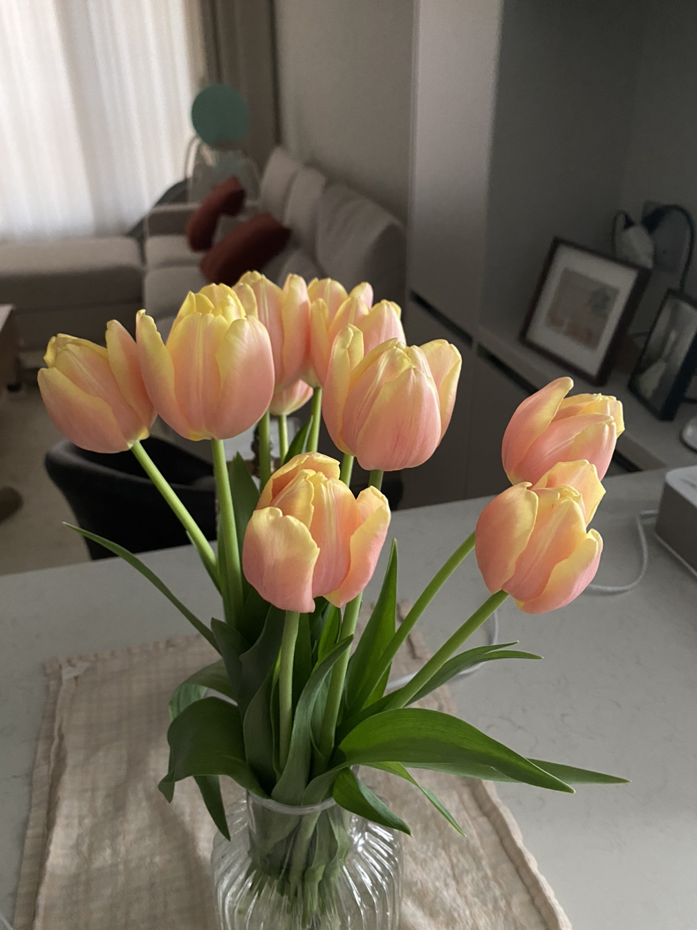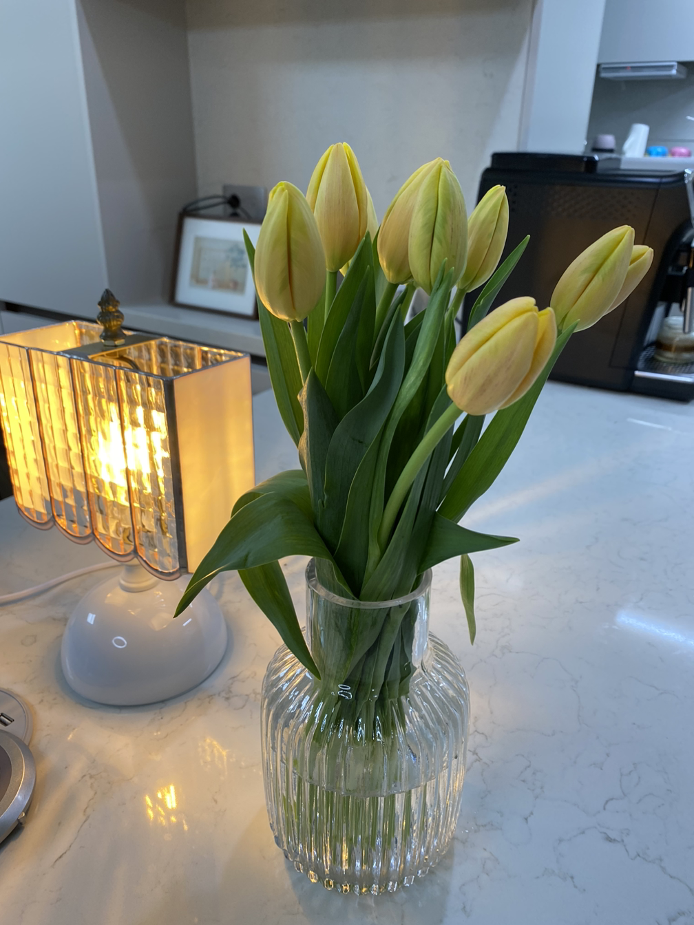 튤립은 대파의 아우라로 우리 집 문을 열었다. 줄기에서 꽃이 만들어진 지 얼마 되지 않는 것을 증명이라도 하듯 꽃이라기 보단 풀잎처럼 초록빛을 더 머금고 있었다. 나는 그 서툴고 투박한 모습이 마음에 들었다. 여성적이다 남성적이다 할 것 없는 그 젠더 뉴트럴함이 귀여웠다.