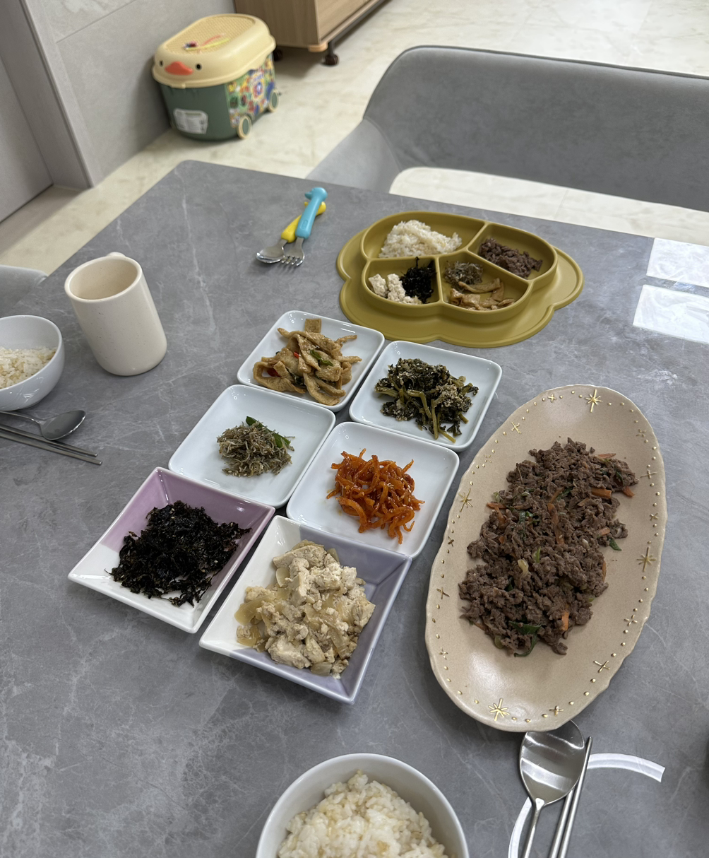 다음 날인 월요일이 또 회사에서 중요하고 바쁜 날이라 엄마가 와주셨다. 엄마가 약속 장소에 일찍 도착해서 귀여운 식기와 우주 옷들, 장난감들을 사주셨다. 엄마, 아빠에게는 평생 받기만 하는구나, 싶어서 미안한 마음이 크다.